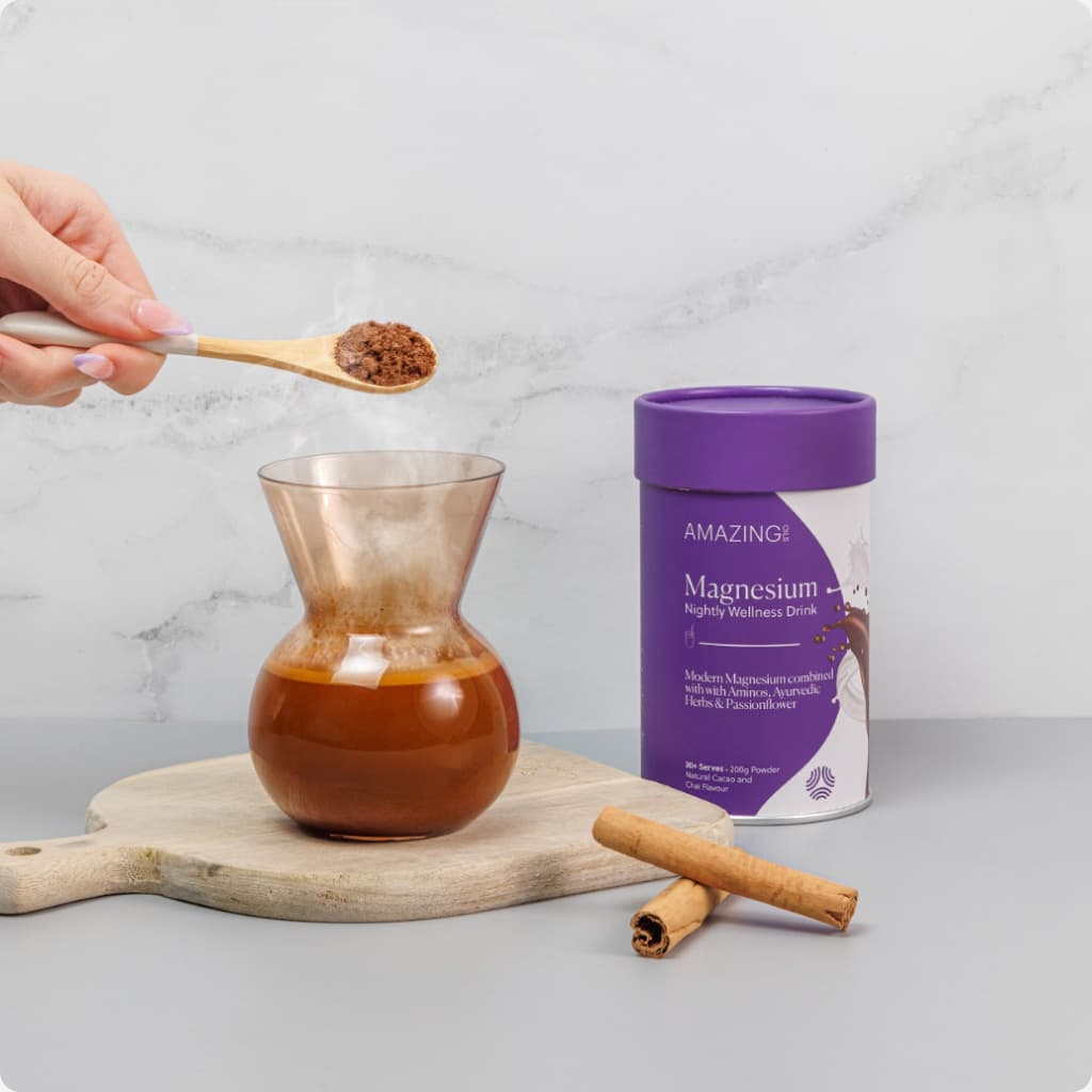 Our Nightly Wellness Drink is one of the best-kept secrets in natural health, combining innovations in sleep science with traditional Eastern remedies. With all-natural ingredients, this delicious chocolatey chai drink is designed to help you unwind, destress and prepare for a restful deep sleep.