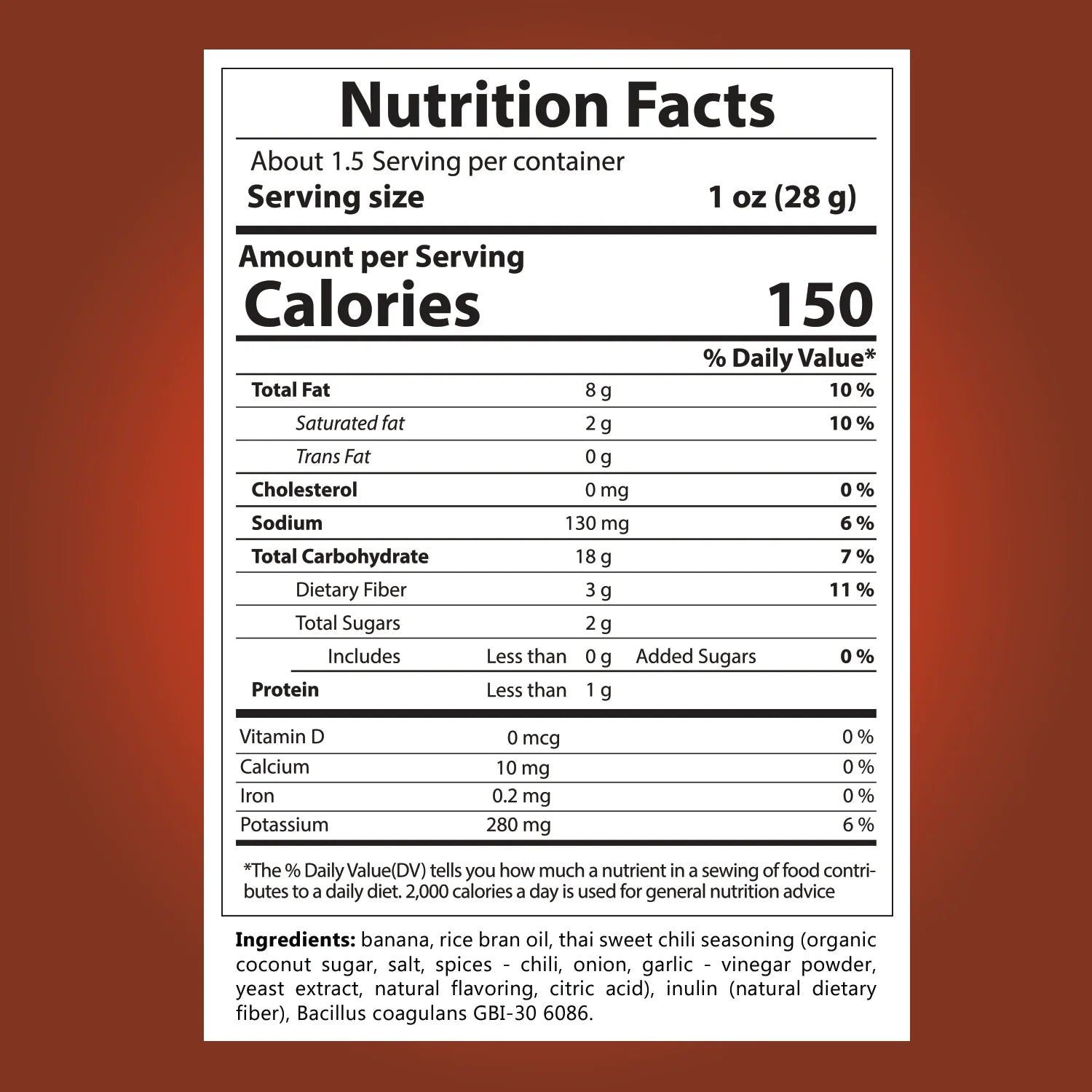 Banana (63%), Rice Bran Oil, Thai Sweet Chilli Seasoning (6.4%) (Organic Coconut Sugar, Salt, Chilli, Onion Powder, Garlic Powder, Vinegar Powder (White Vinegar, Tapioca Maltodextrin), Yeast Extract, Natural Flavouring, Acid (Citric Acid)), Inulin, Probiotic (Bacillus Coagulans GBI-306086).