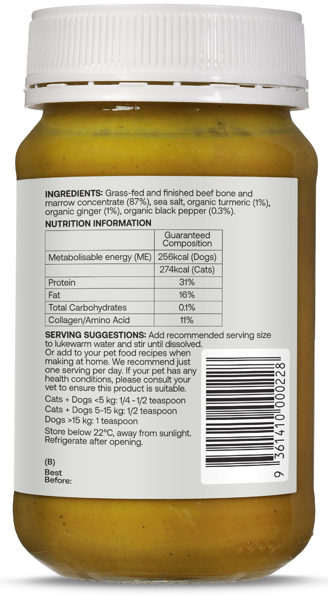 Grass-fed and finished beef bone and marrow concentrate (87%), sea salt, organic turmeric (1%), organic ginger (1%), organic black pepper (0.3%)