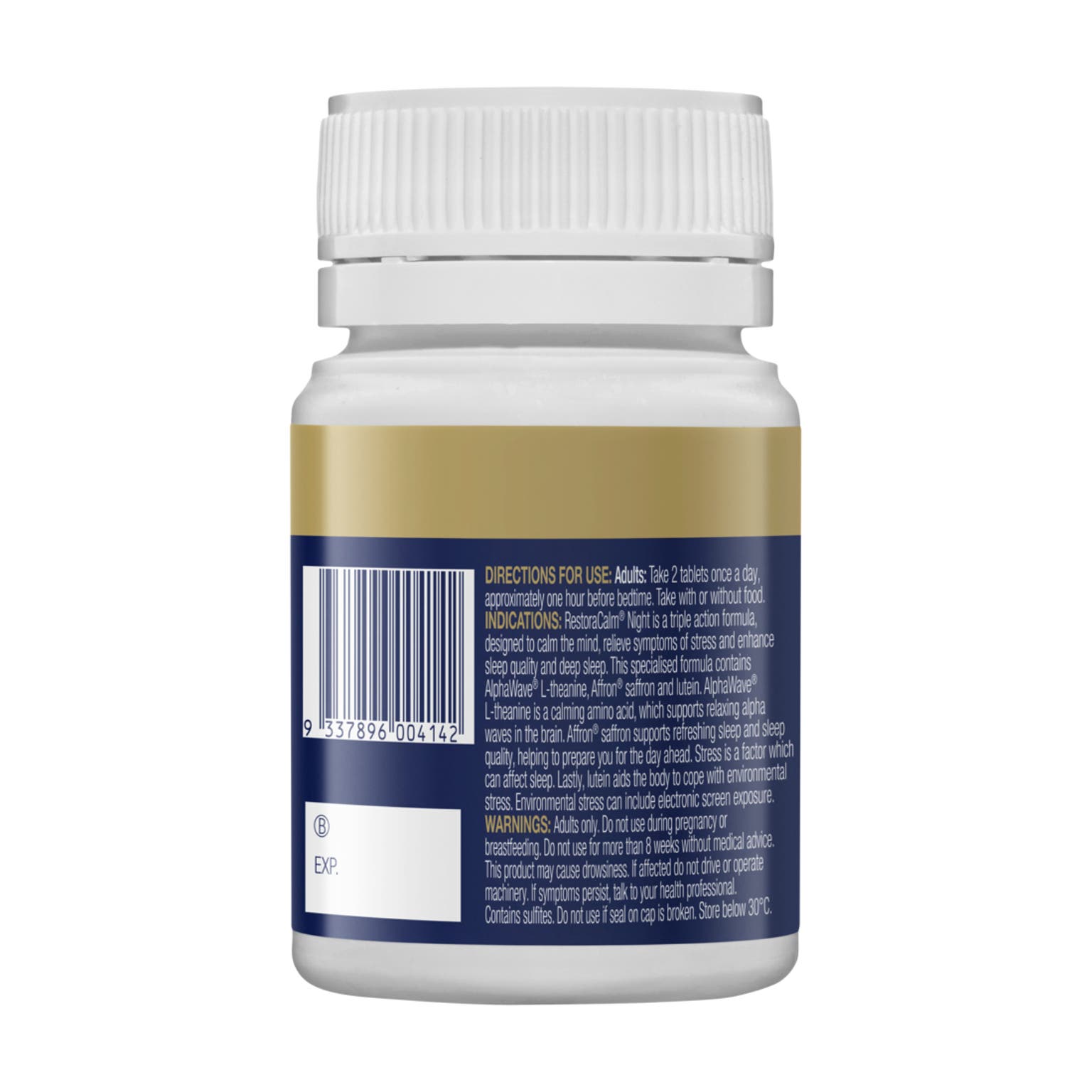 RestoraCalm® Night is a triple action formula, designed to calm the mind, relieve symptoms of stress and enhance sleep quality and deep sleep. This specialised formula contains AlphaWave® L-theanine, Affron® saffron (Affron® is a registered trademark of Pharmactive Biotech Products, S.L.U) and lutein. AlphaWave® L-theanine is a calming amino acid, which supports relaxing alpha waves in the brain. Affron® saffron supports refreshing sleep and sleep quality, helping to prepare you for the day ahead. Stress is a factor which can affect sleep. Lastly, lutein aids the body to cope with environmental stress. Environmental stress can include electronic screen exposure.