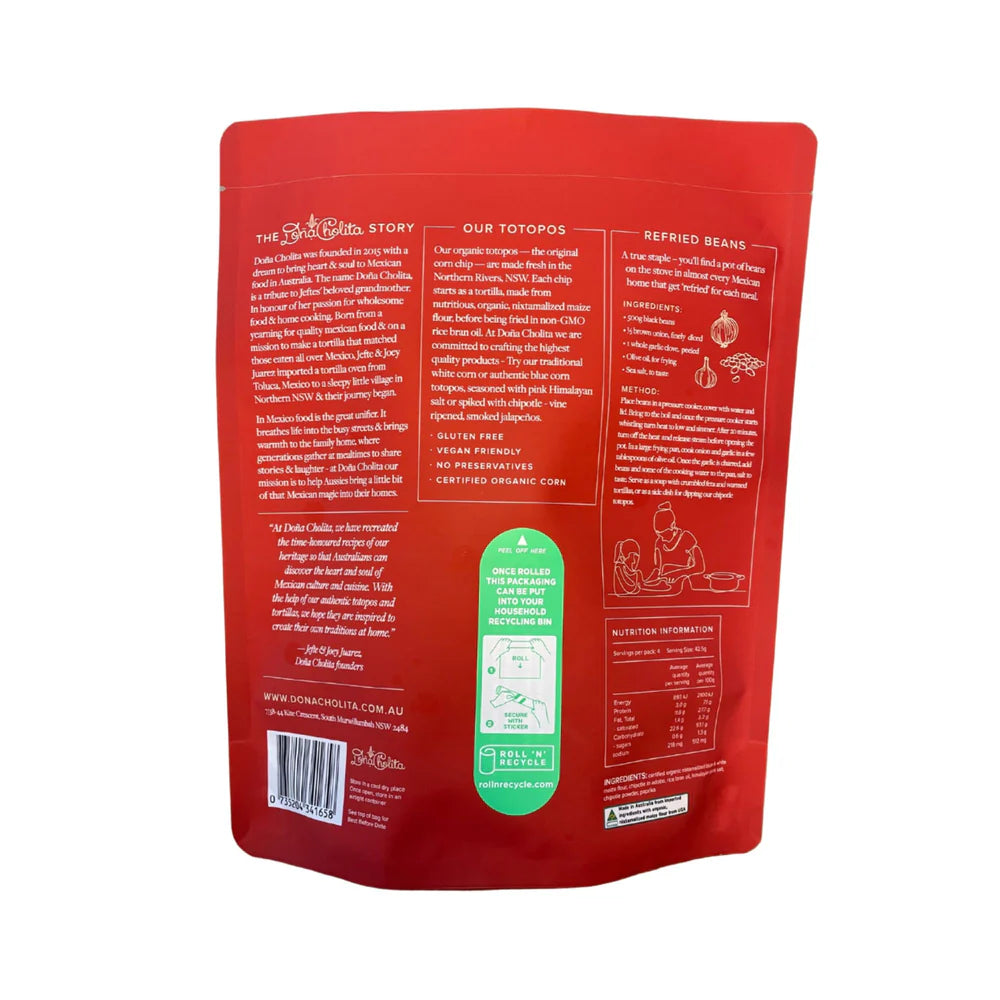 The name Doña Cholita, is a tribute to Jeftes' beloved grandmother. In honour of her passion for wholesome food & home cooking. Born from a yearning for quality Mexican food & on a mission to make a tortilla that matched those eaten all over Mexico, Jefte & Joey Juarez imported a tortilla oven from Toluca, Mexico to a sleepy little village in Northern NSW & their journey began.