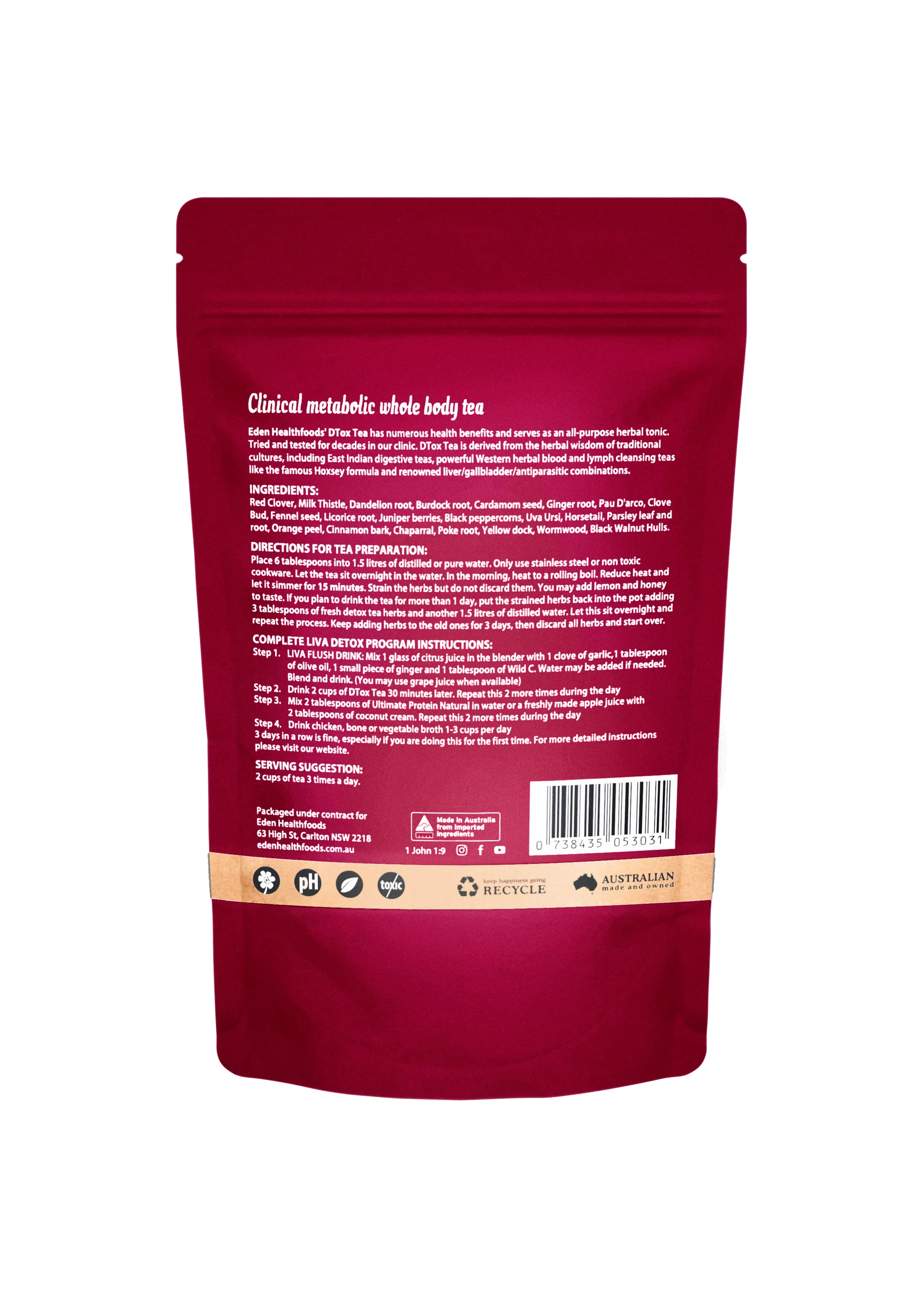 Red Clover, Milk Thistle, Dandelion Root, Burdock Root, Cardamom Seed, Ginger Root, Pau D'Arco, Clove Bud, Fennel Seed, Licorice Root, Juniper Berries, Black Peppercorns, Uva Ursi, Horsetail, Parsley Leaf and Root, Orange Peel, Cinnamon Bark, Chaparral, Poke Root, Yellow Dock, Wormwood, Black Walnut Hulls.