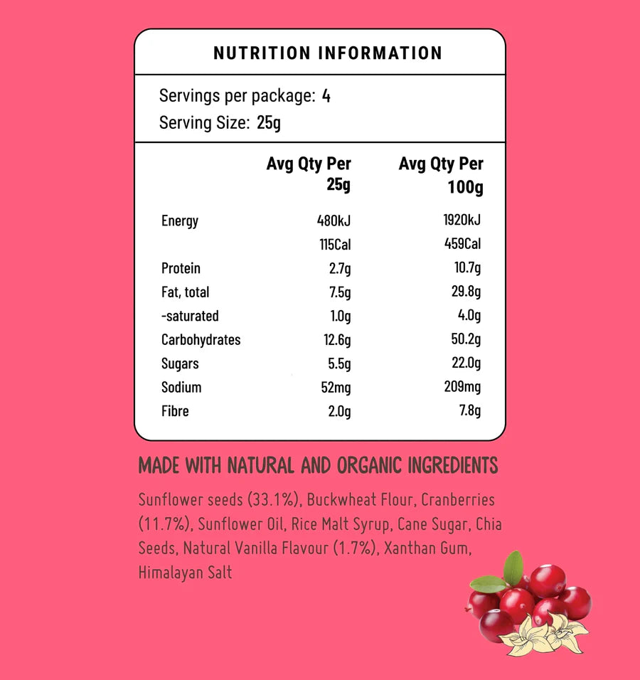 Sunflower Seeds, Buckwheat Flour, Cranberries, High-oleic Sunflower Oil, Rice Malt Syrup, Cane Sugar, Chia Seeds, Natural Vanilla Flavour, Xanthan Gum, Himalayan Salt
