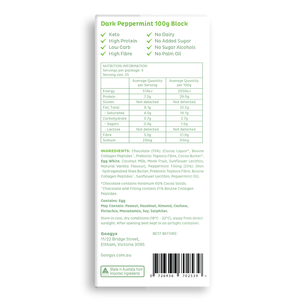 Googys Peppermint Dark Protein Chocolate is a premium chocolate with well-balanced cocoa, vanilla and coconut notes. Googys protein chocolate has a creamy peppermint filling with collagen to promote skin and gut health and eggwhite for an extra protein punch.
