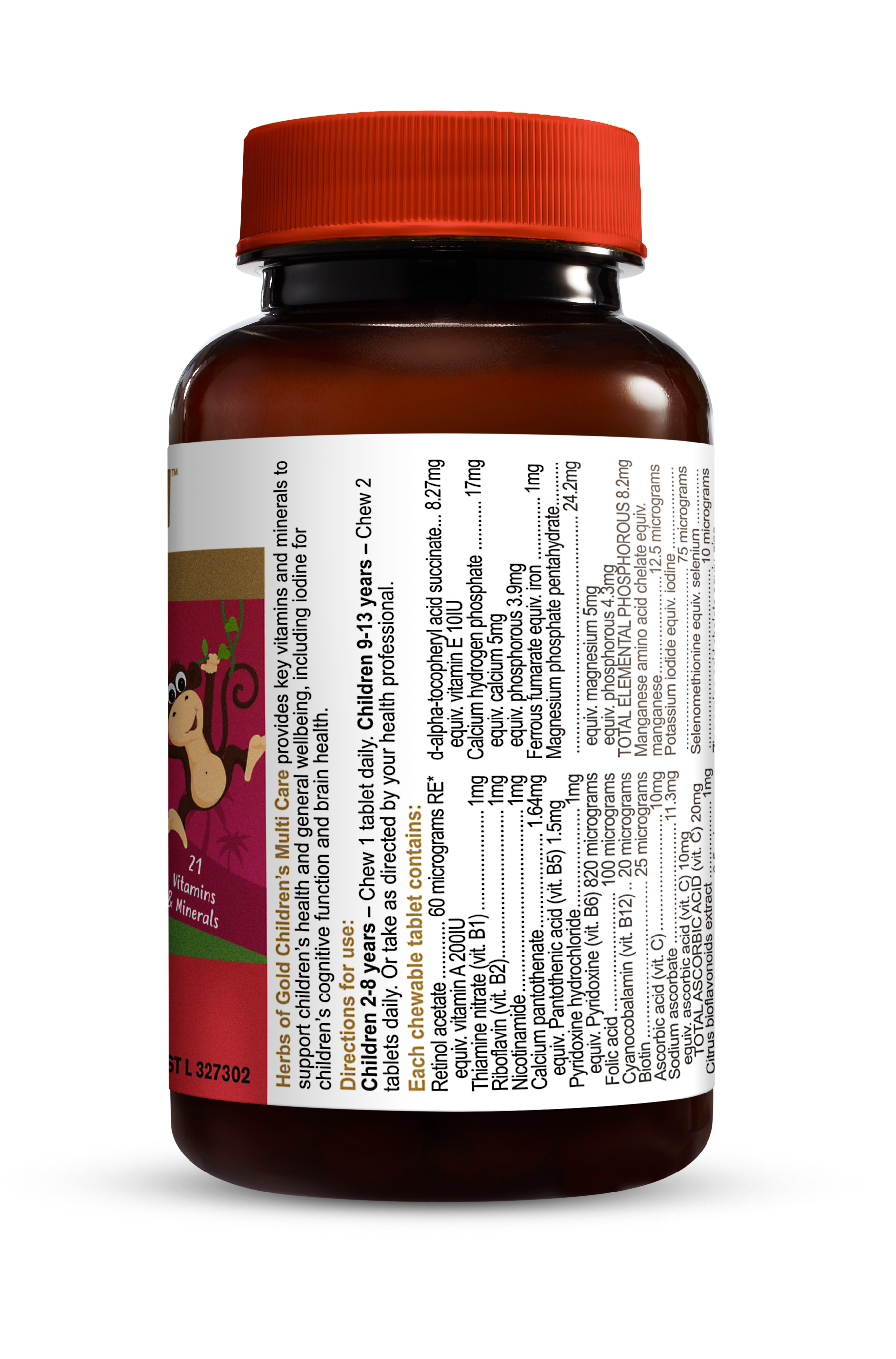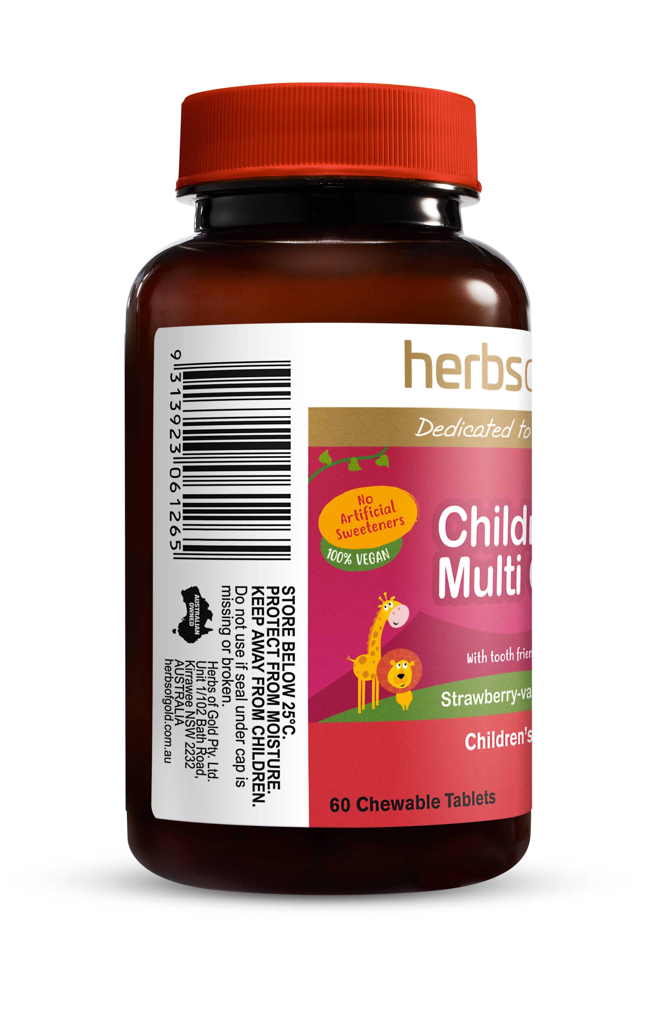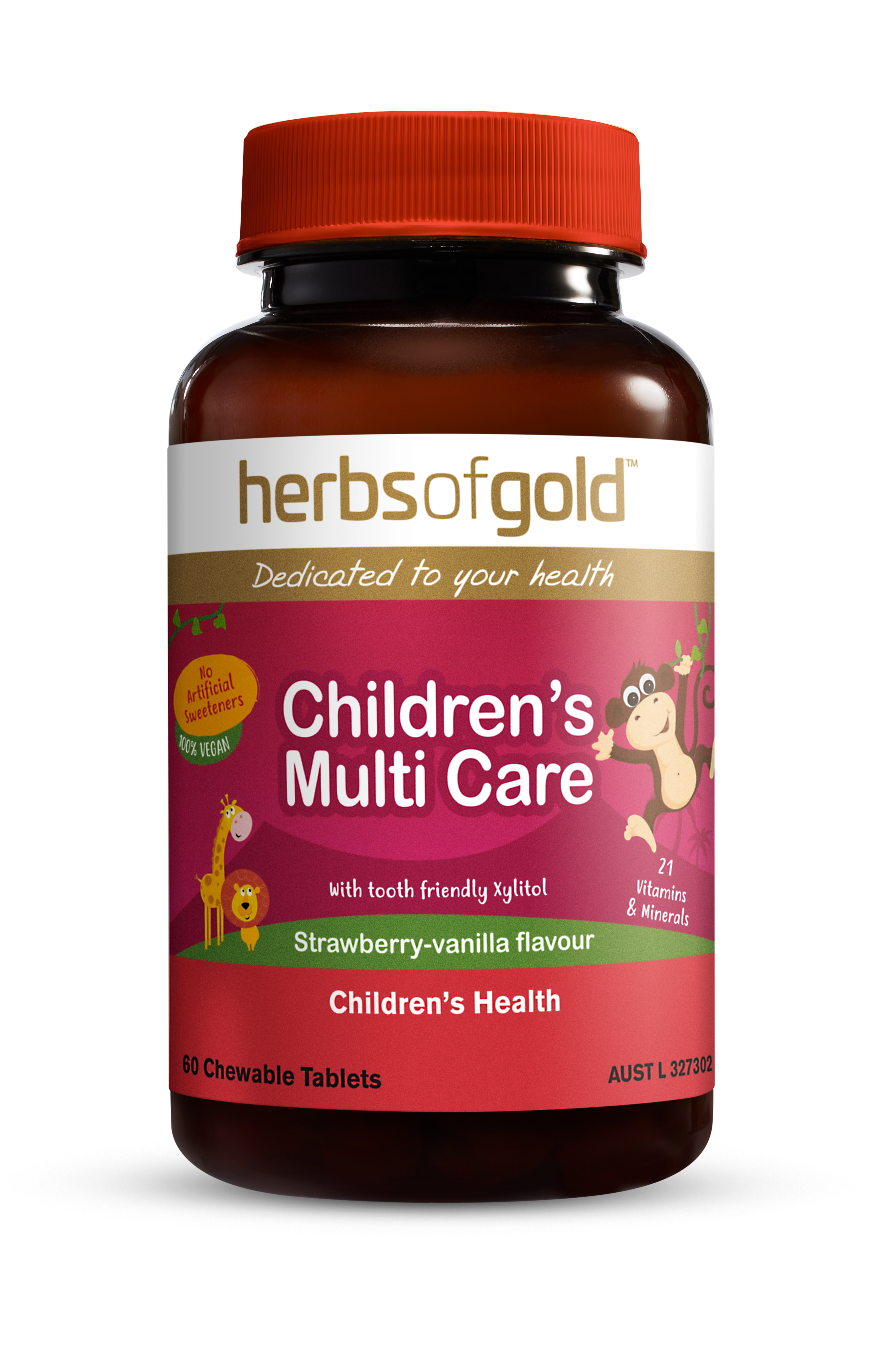 Herbs of Gold Children’s Multi Care is a delicious strawberry-vanilla chewable tablet naturally sweetened with Xylitol to support general health and wellbeing in children.