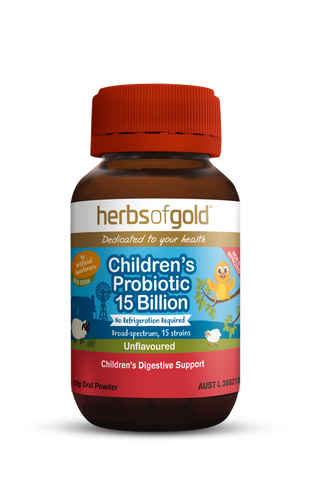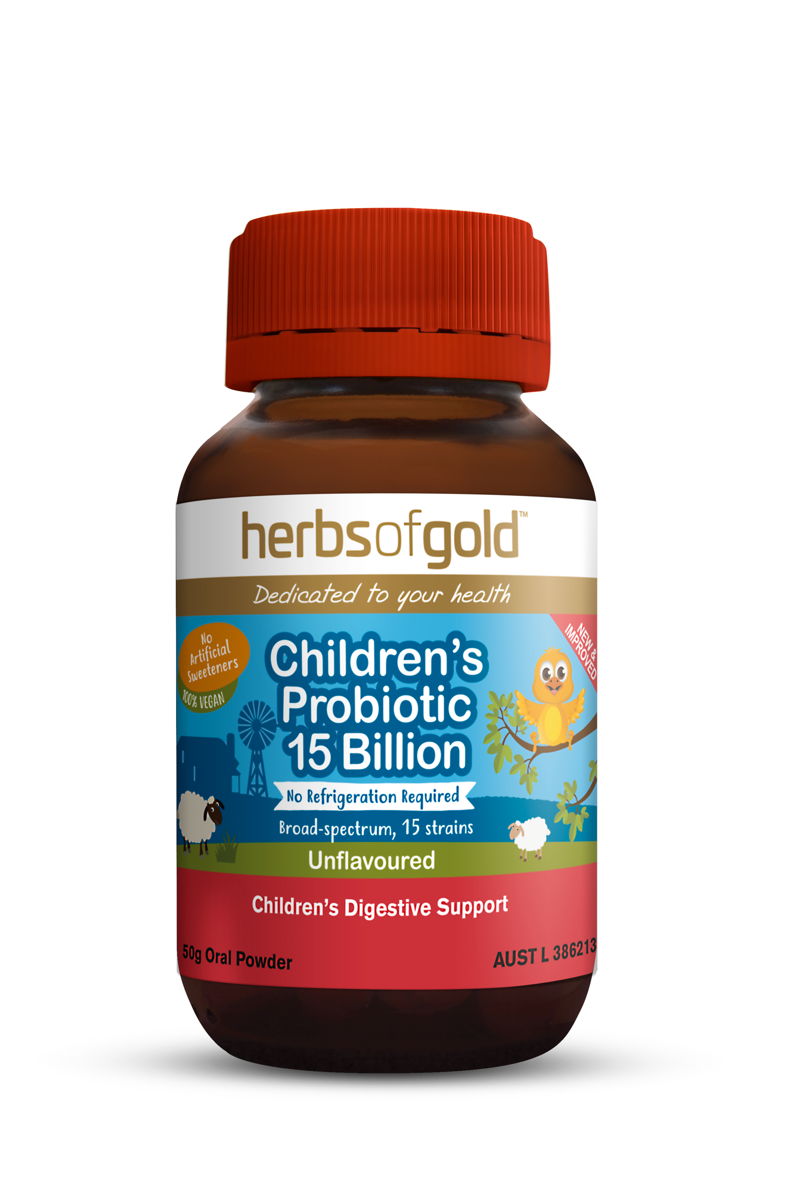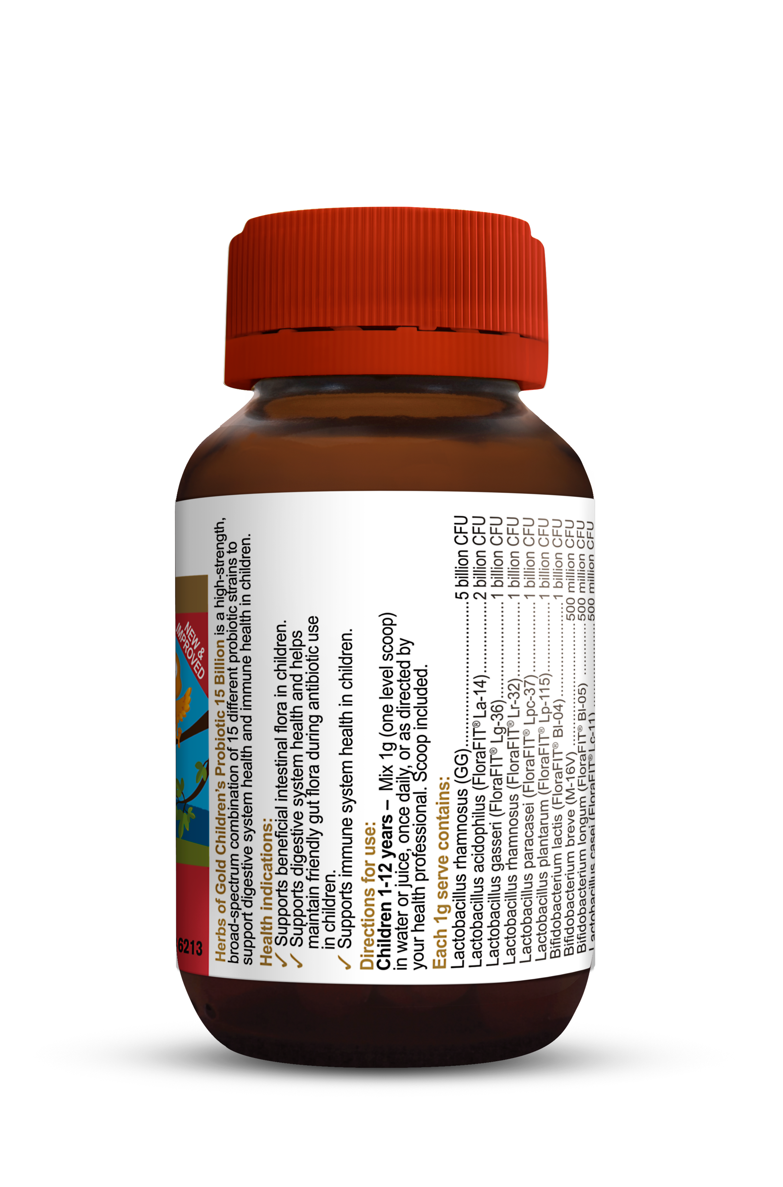 Herbs of Gold Children’s Probiotic 15 Billion is a high-strength, multi-strain unflavoured powder formulated to support beneficial flora and digest