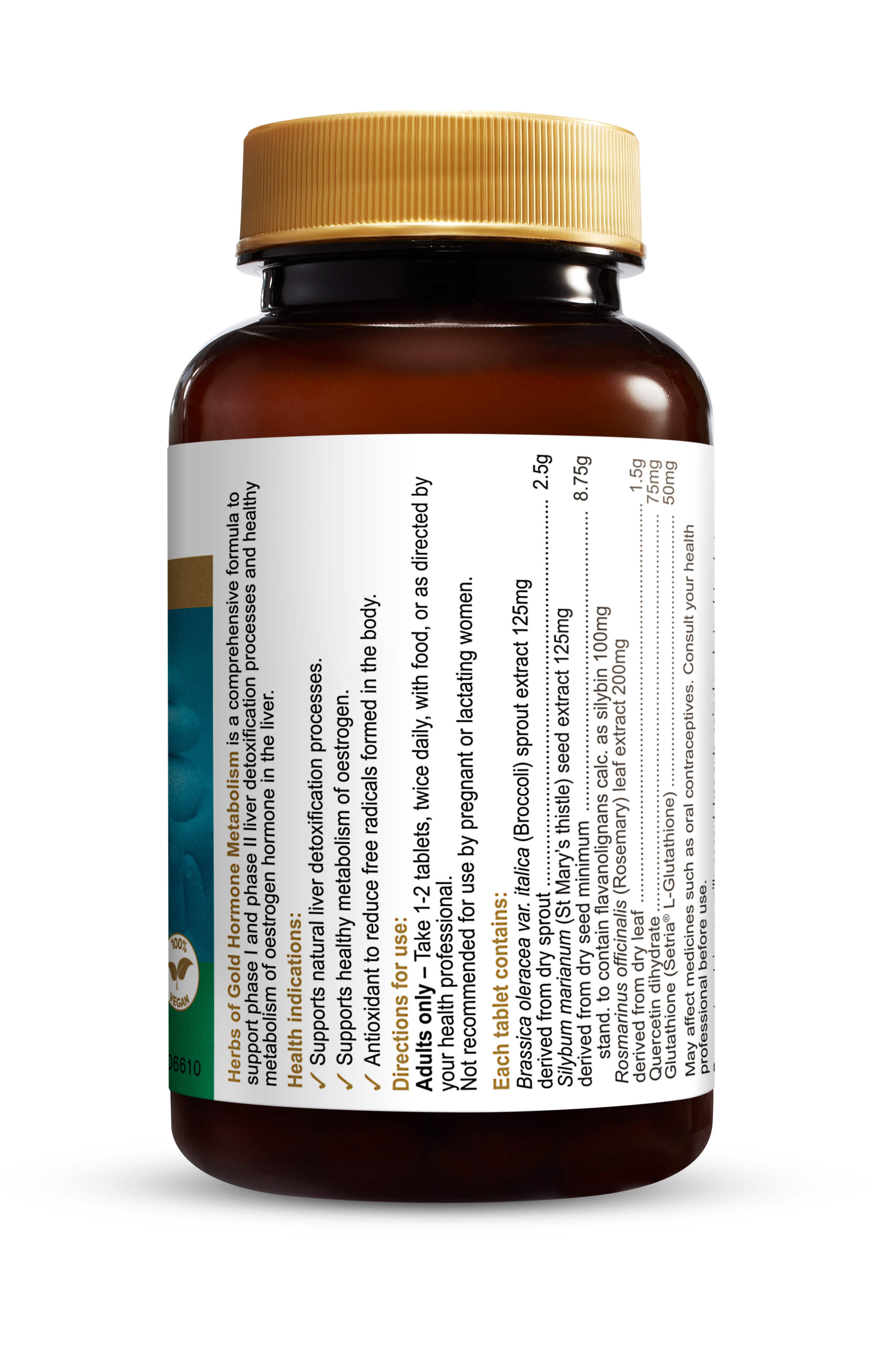 Herbs of Gold Hormone Metabolism is a comprehensive formula to support phase I and phase II liver detoxification processes and healthy metabolism of oestrogen hormone in the liver.