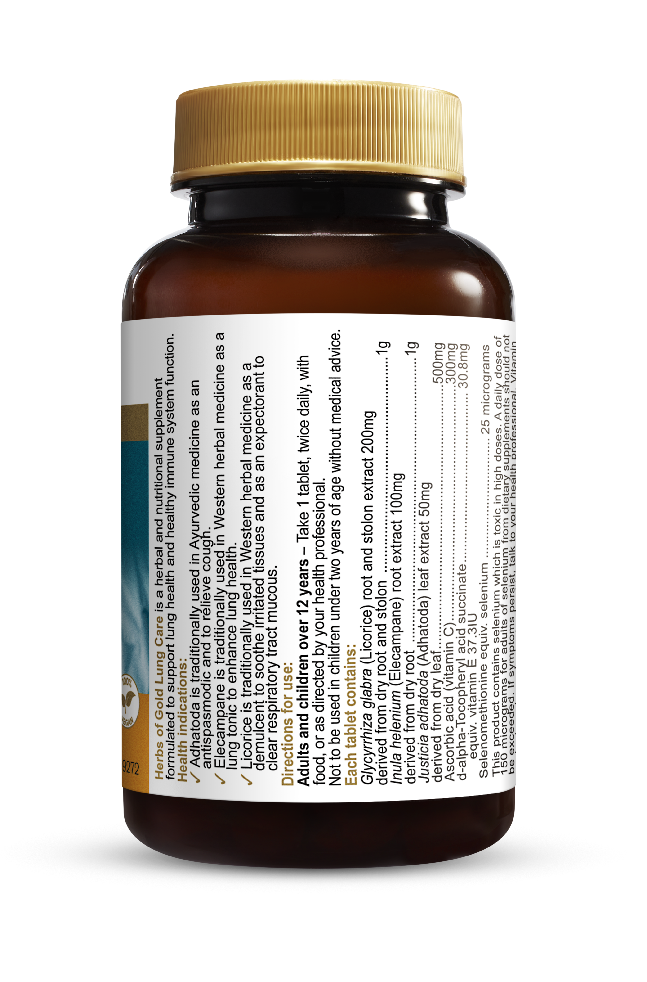 Herbs of Gold Lung Care has been specifically formulated with traditional herbs plus antioxidant vitamins C and E to support lung health.