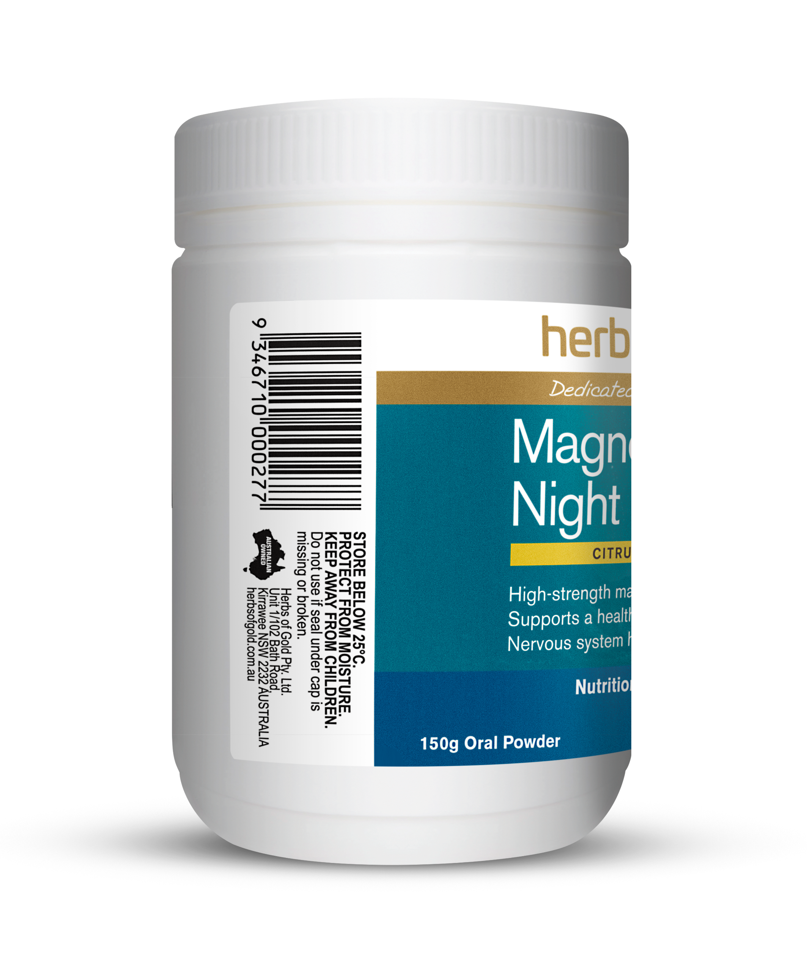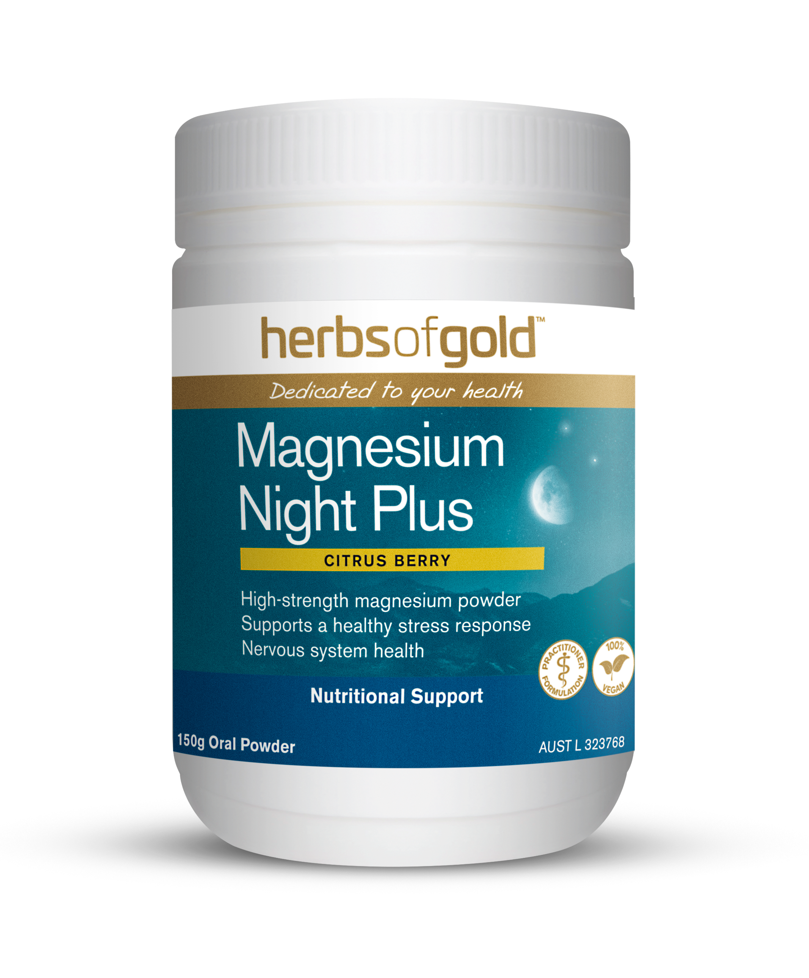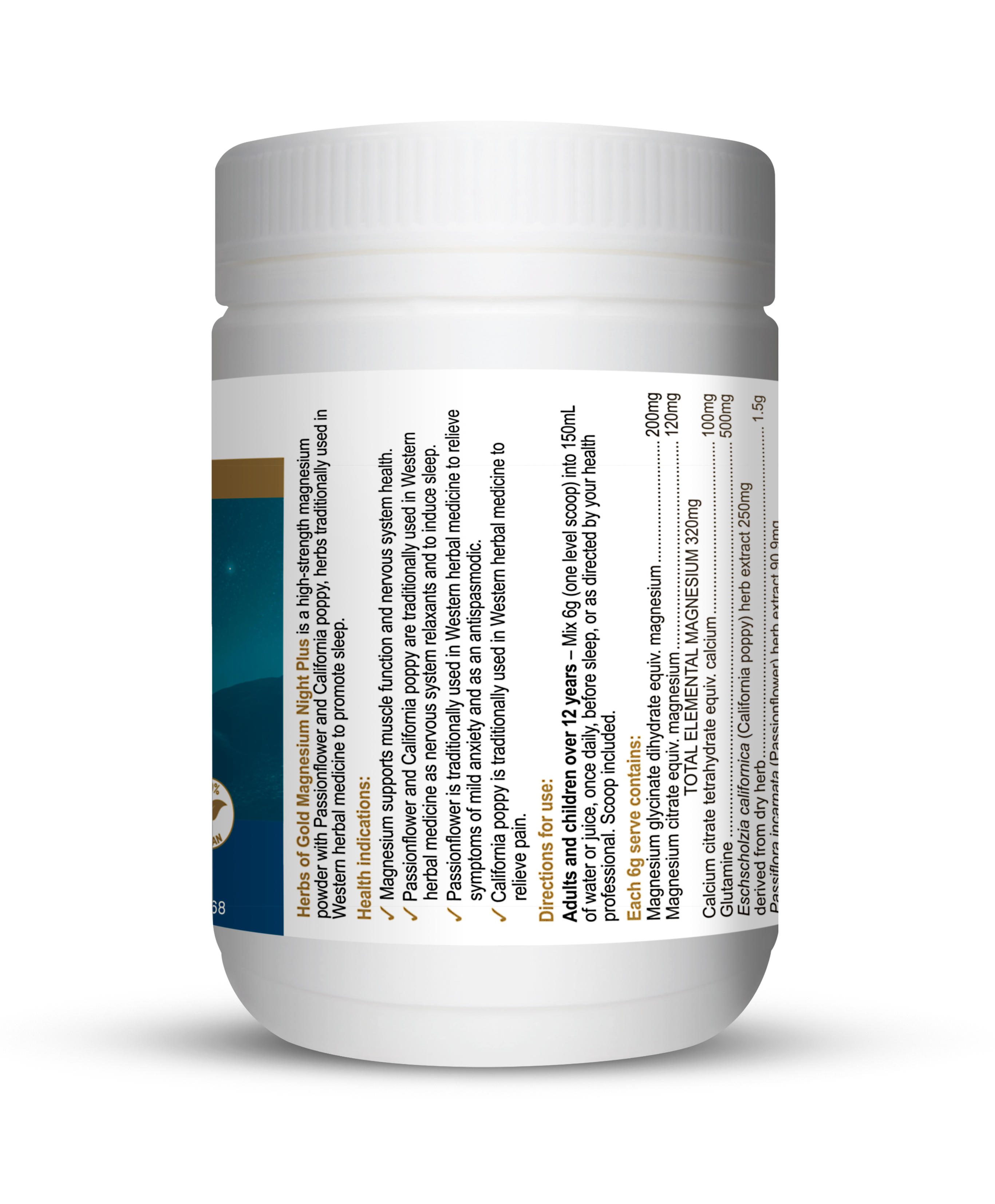 Herbs of Gold Magnesium Night Plus is a delicious citrus berry flavoured powder that contains high-strength magnesium plus Passionflower and California poppy, herbs traditionally used in Western herbal