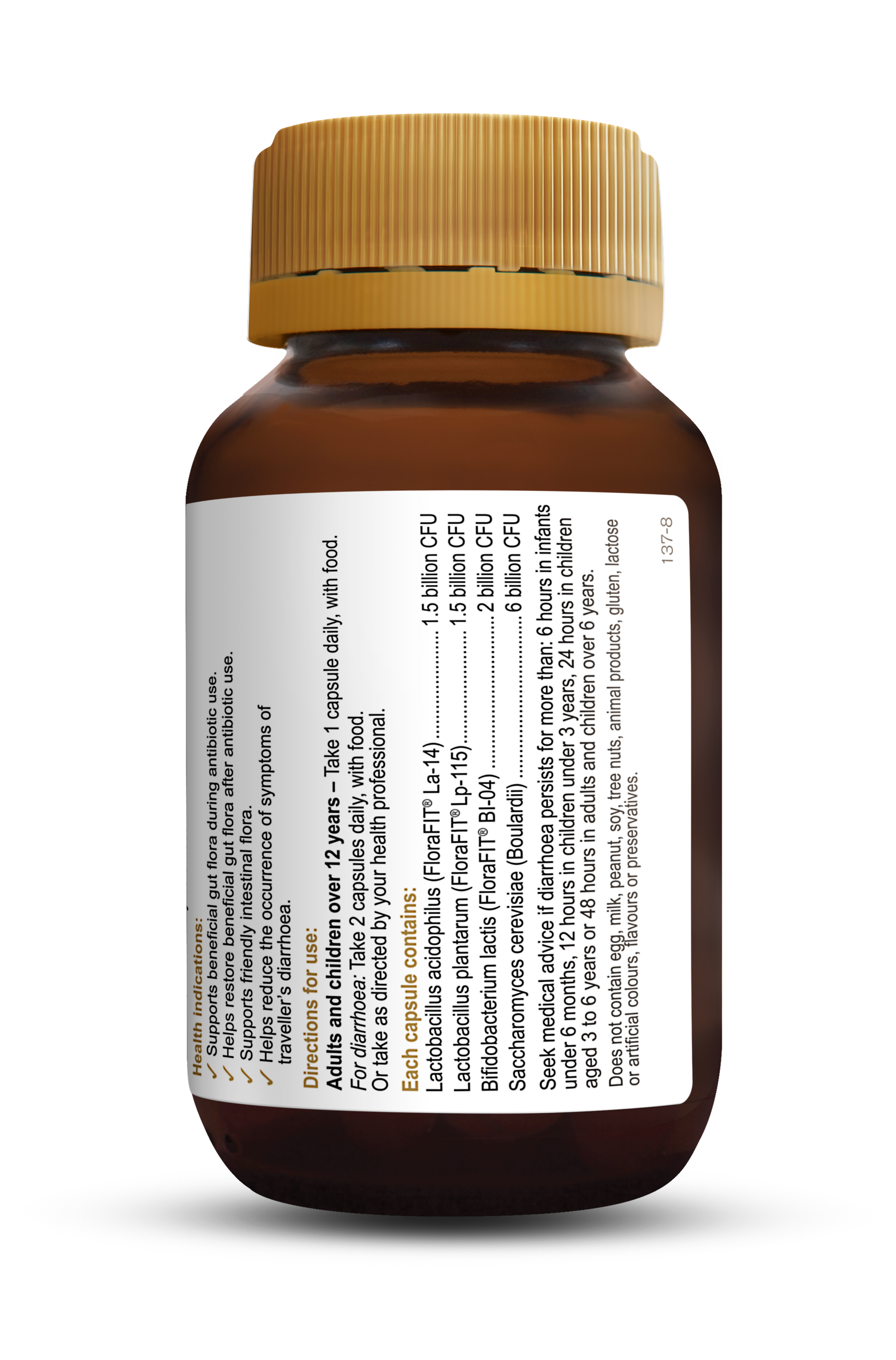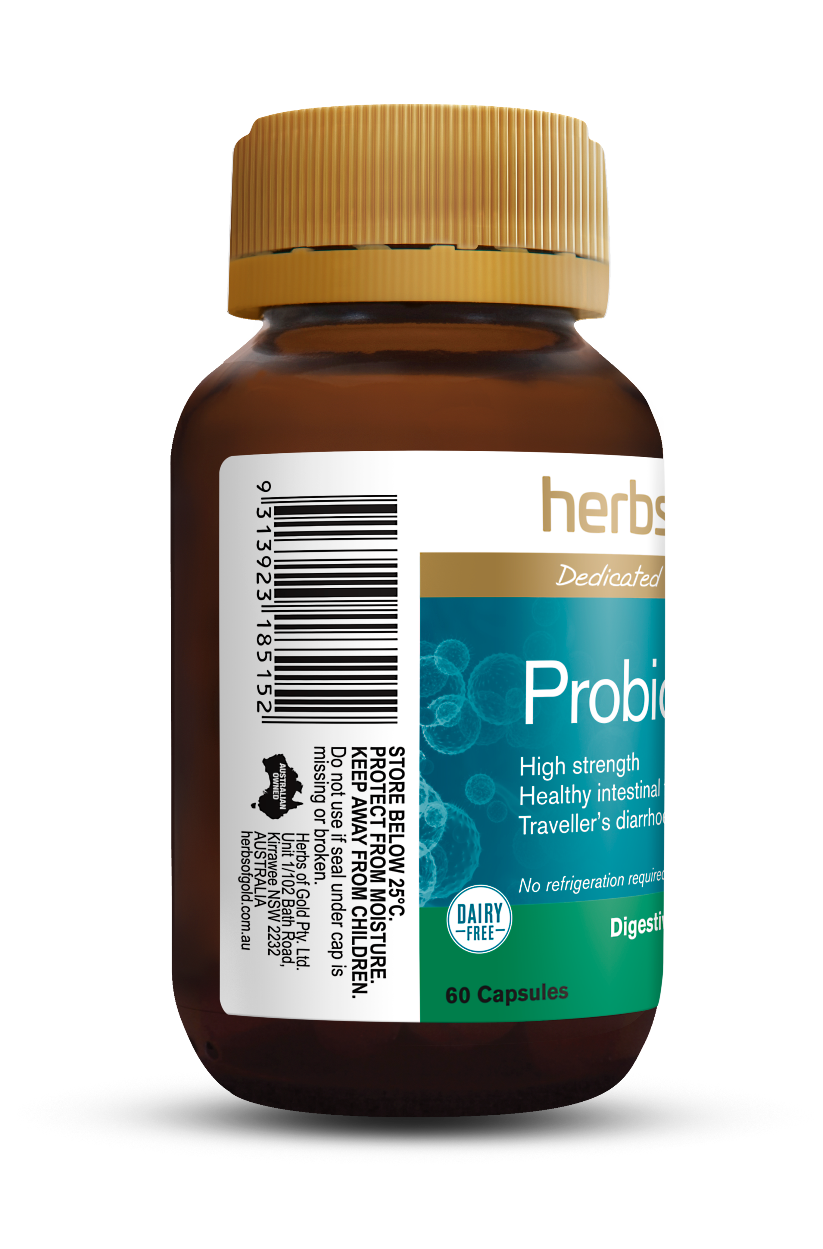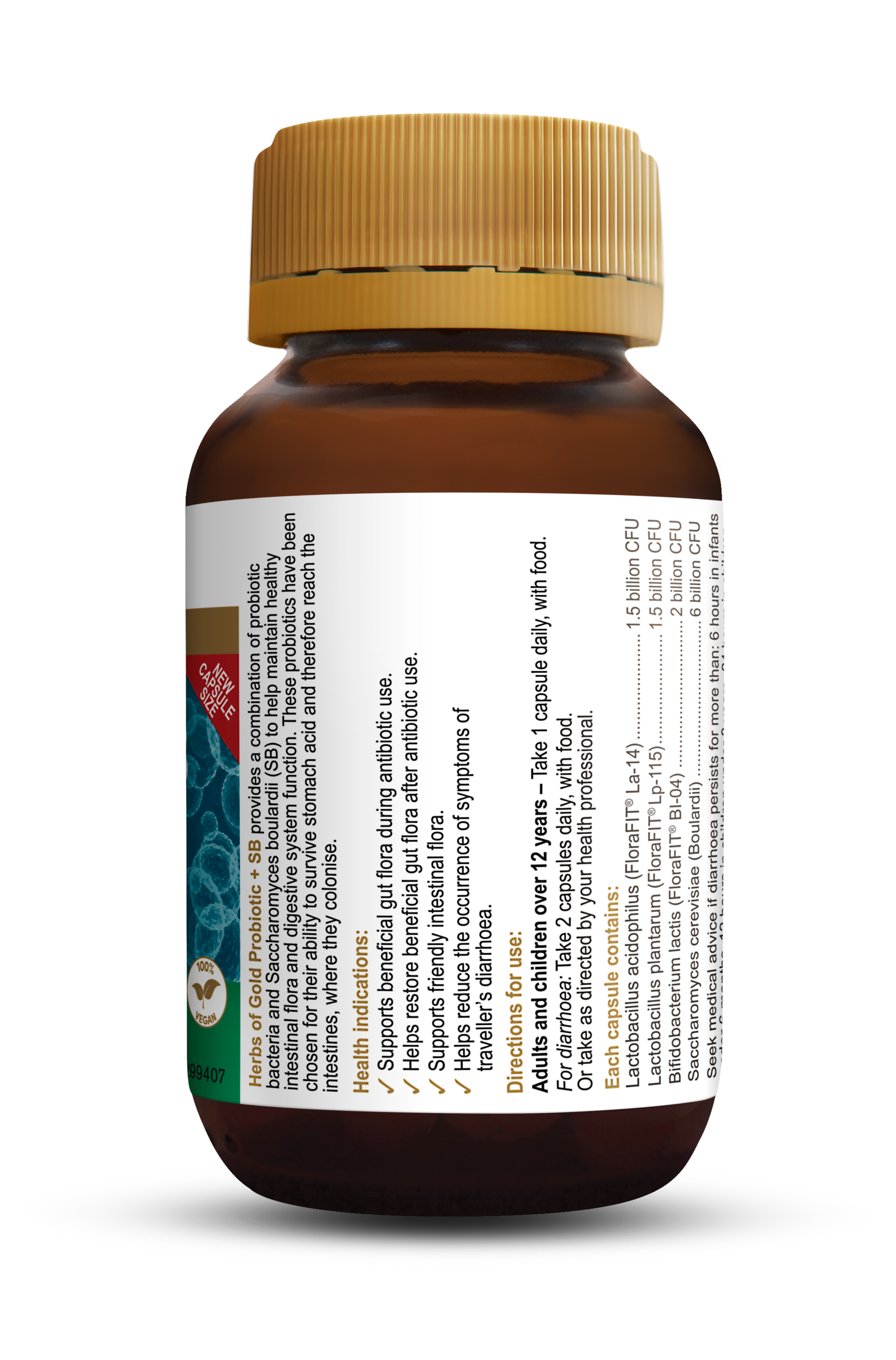 Herbs of Gold Probiotic + SB is a probiotic complex containing Saccharomyces boulardii (SB) to support beneficial intestinal flora.