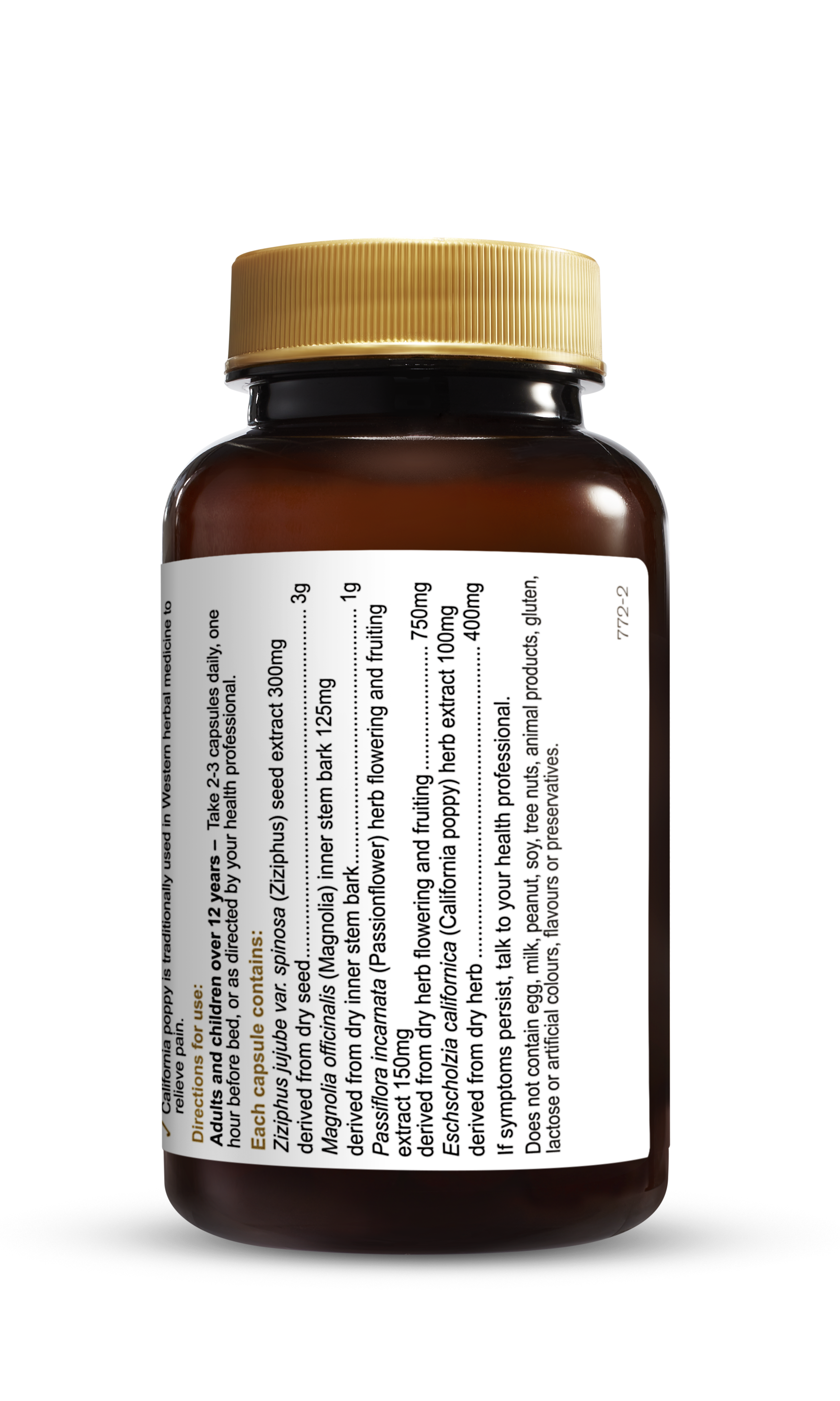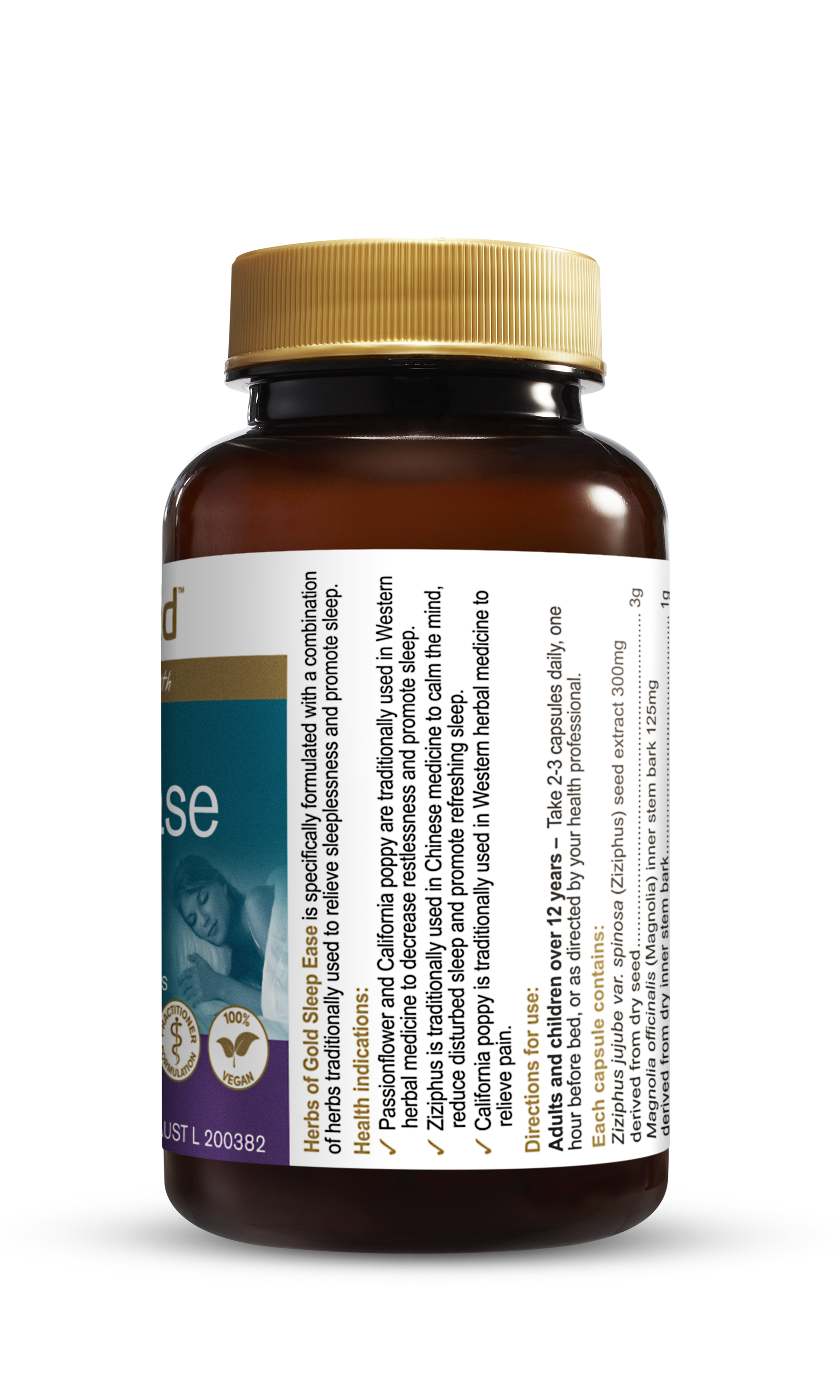 Herbs of Gold Sleep Ease contains herbs traditionally used in Western herbal medicine to promote sleep.