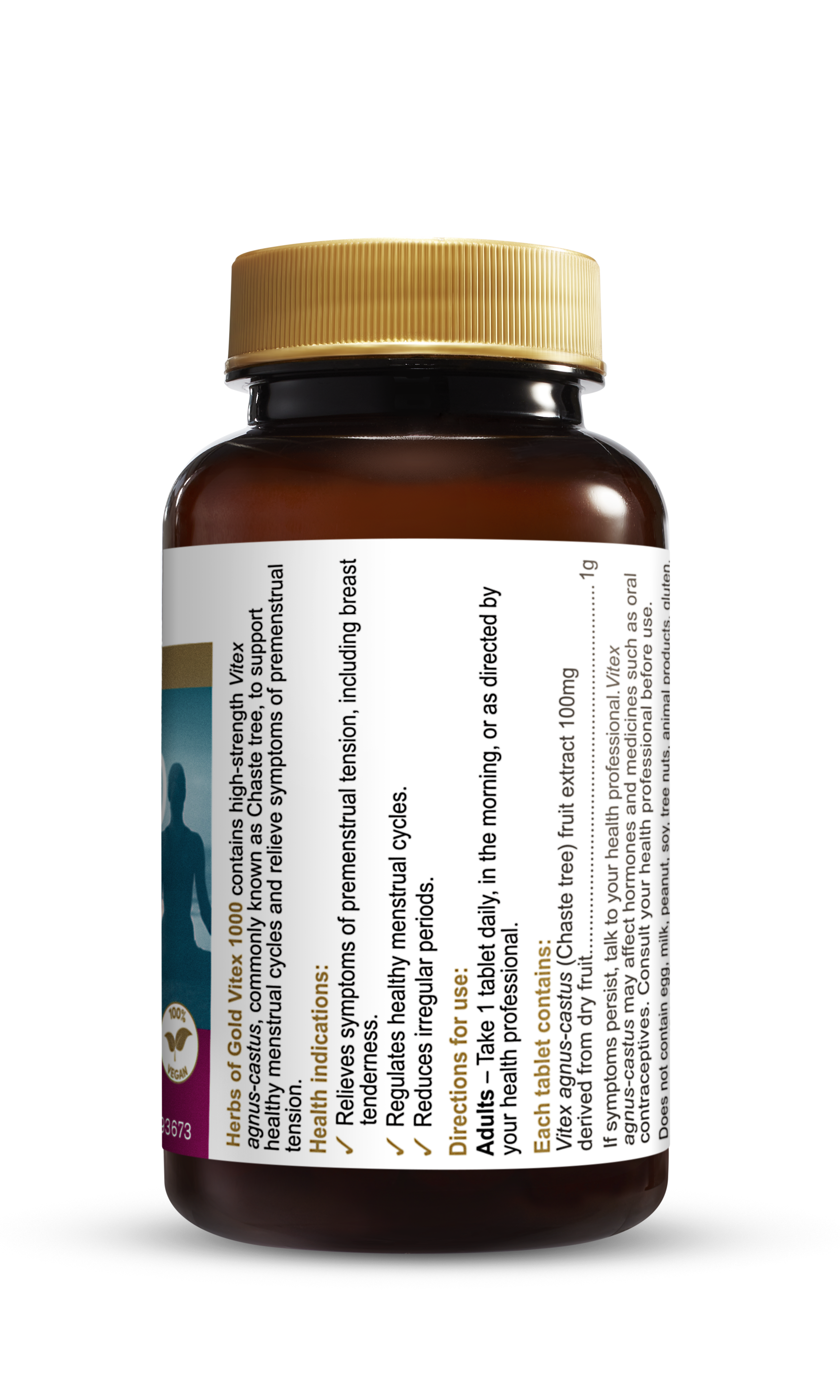 Herbs of Gold Vitex 1000 contains Chaste tree fruit to relieve symptoms of premenstrual tension (PMT).