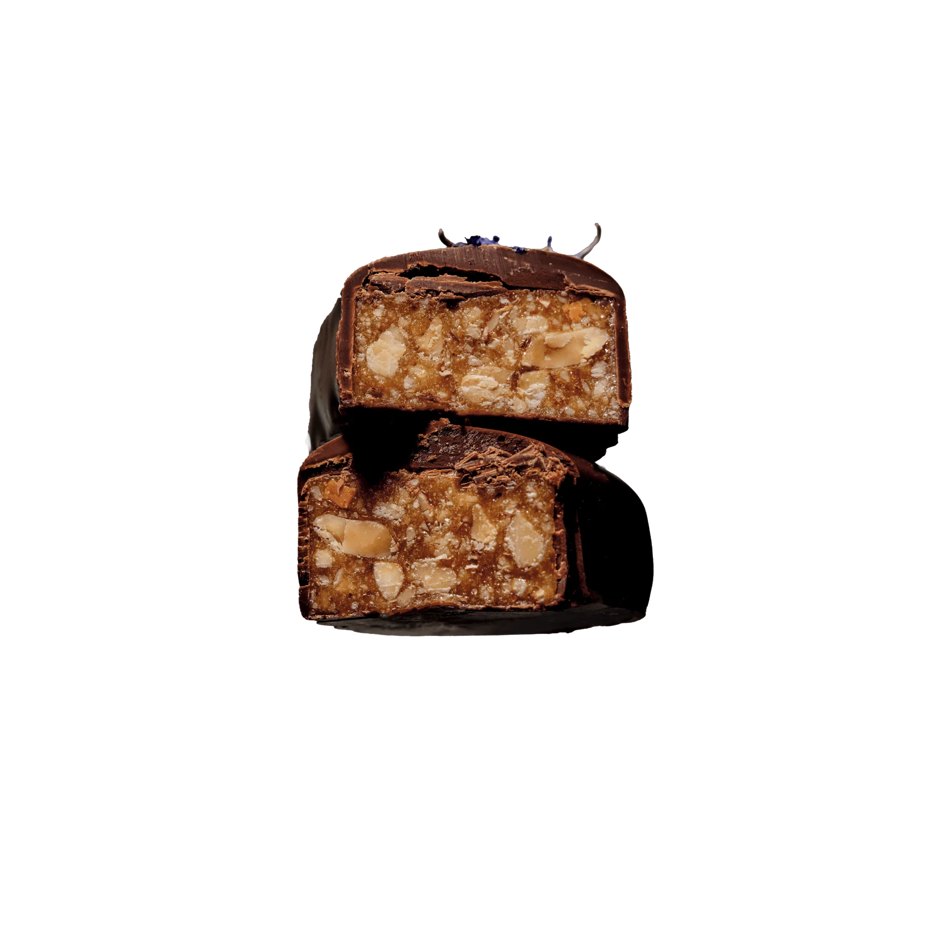 Chewy almond butter caramel blended with crunchy tamari toasted almond pieces for that umami experience. Spiked with adaptogen ashwagandha. Topped with brilliant blue corn flowers for your visual pleasure. Touching all the senses with this delicious delight.