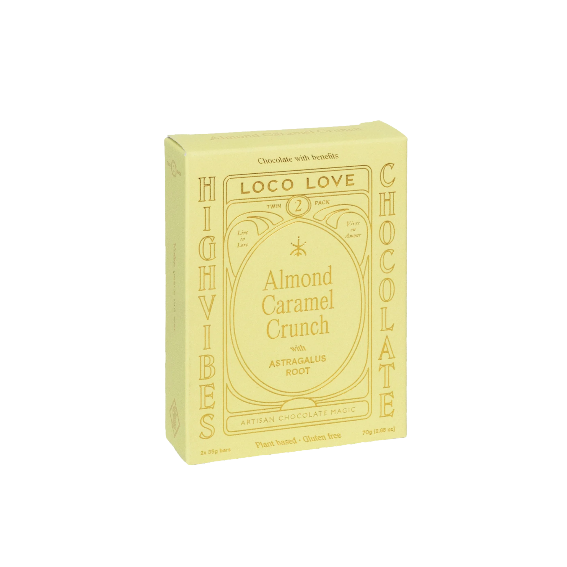 Australian almonds (36.4%), *cacao paste, *coconut blossom sugar, *cacao butter, *brown rice syrup, *coconut milk, wild crafted astragalus (1%), caramel extract (0.01%), Australian sea salt, *blue corn flower petal, *tamari (soy). [Cacao solids 25%]. *Organic. Contains: almonds and soy. May be present: sesame, peanut, pecan, hazelnut, macadamia, cashew, pistachio.