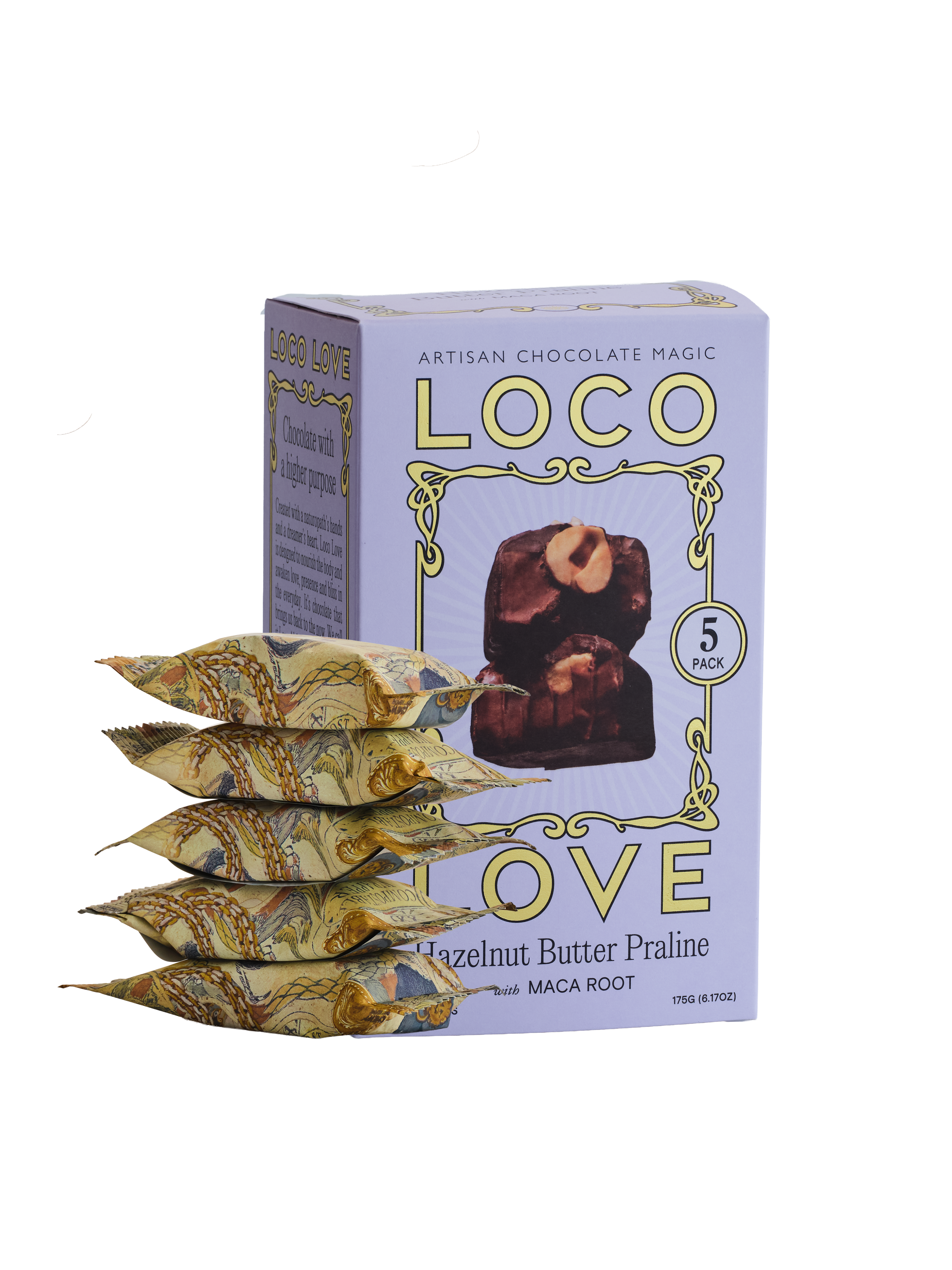 A smooth and freshly ground hazelnut butter center, with a few crunchy surprises. Spiked with Peruvian ginseng aka maca powder, which is known for its adaptogenic qualities and increasing libido. Think Ferrero Rocher without the harmful sugars. Ceremoniously inhale the nutty, cacao-drenched aroma for a sensorial delight.
