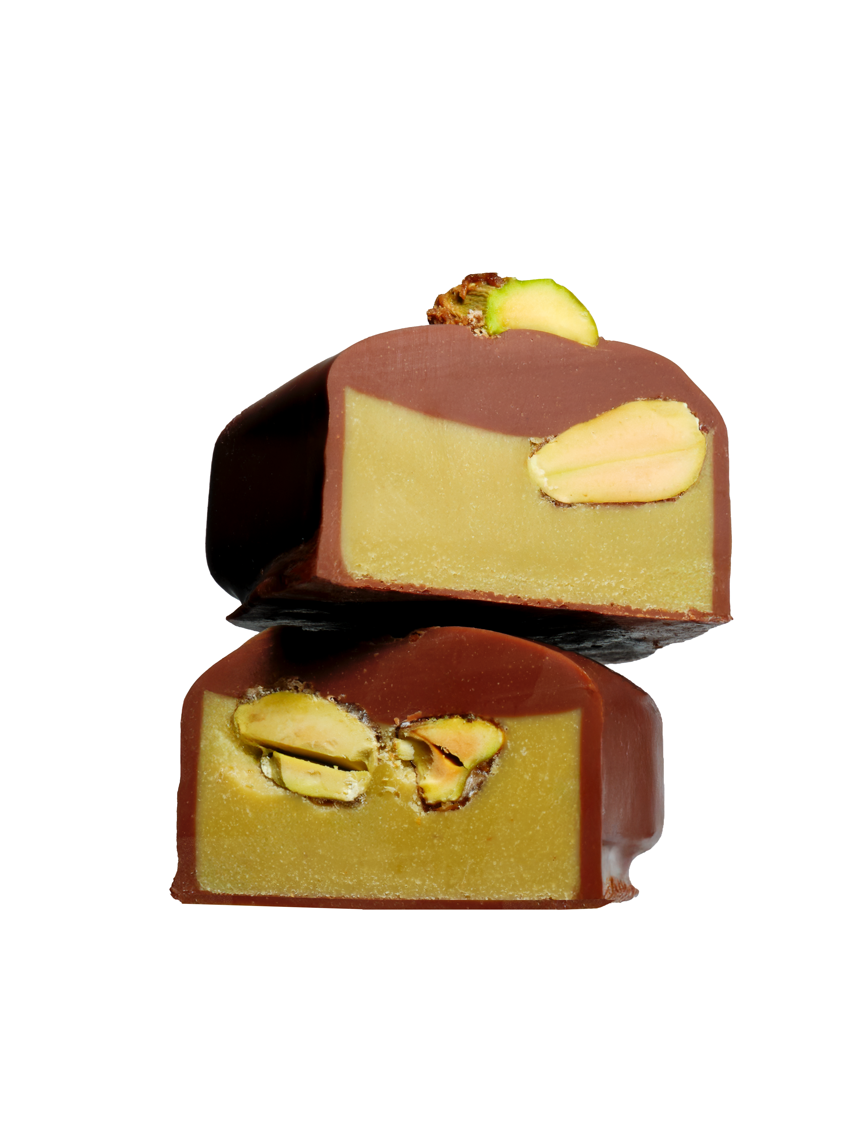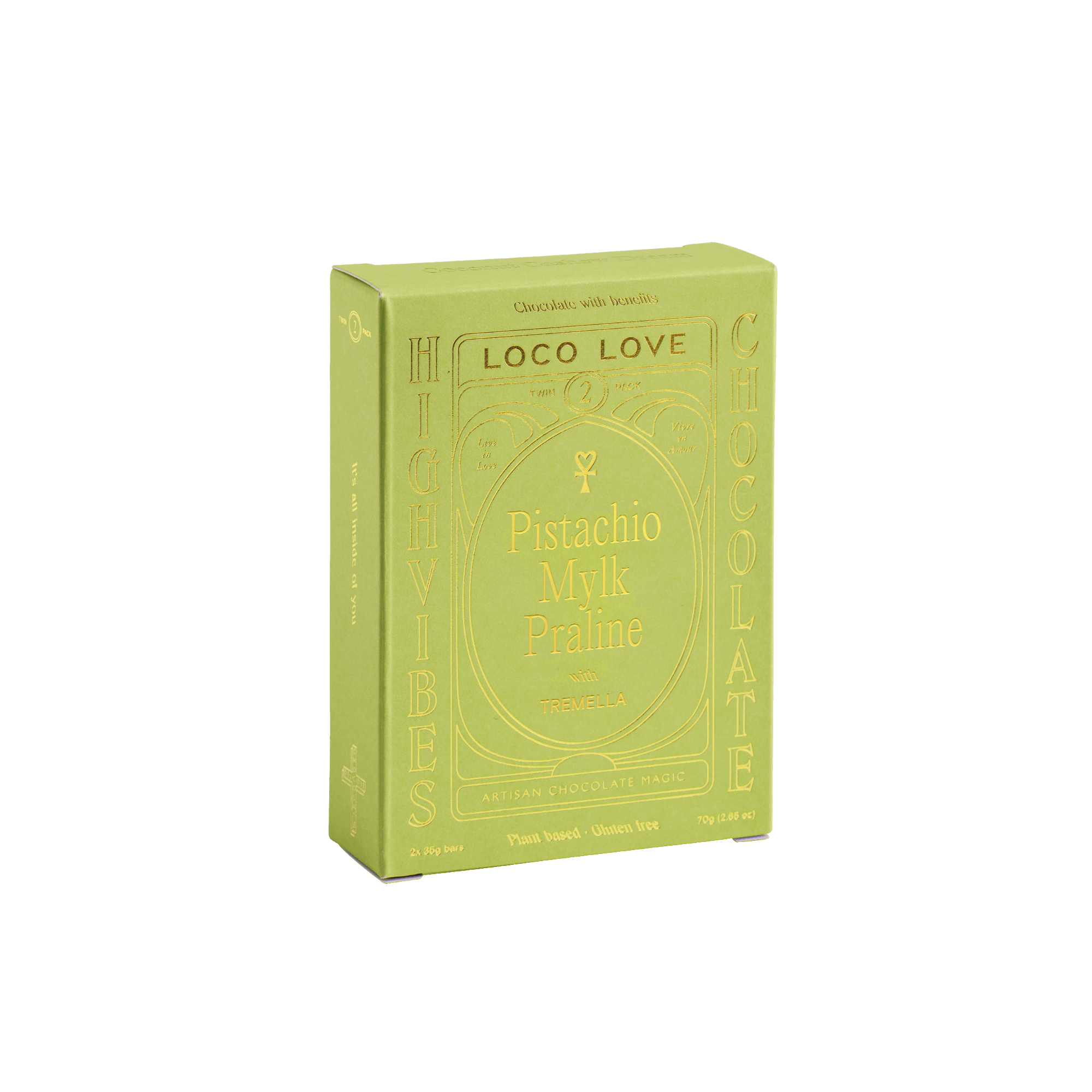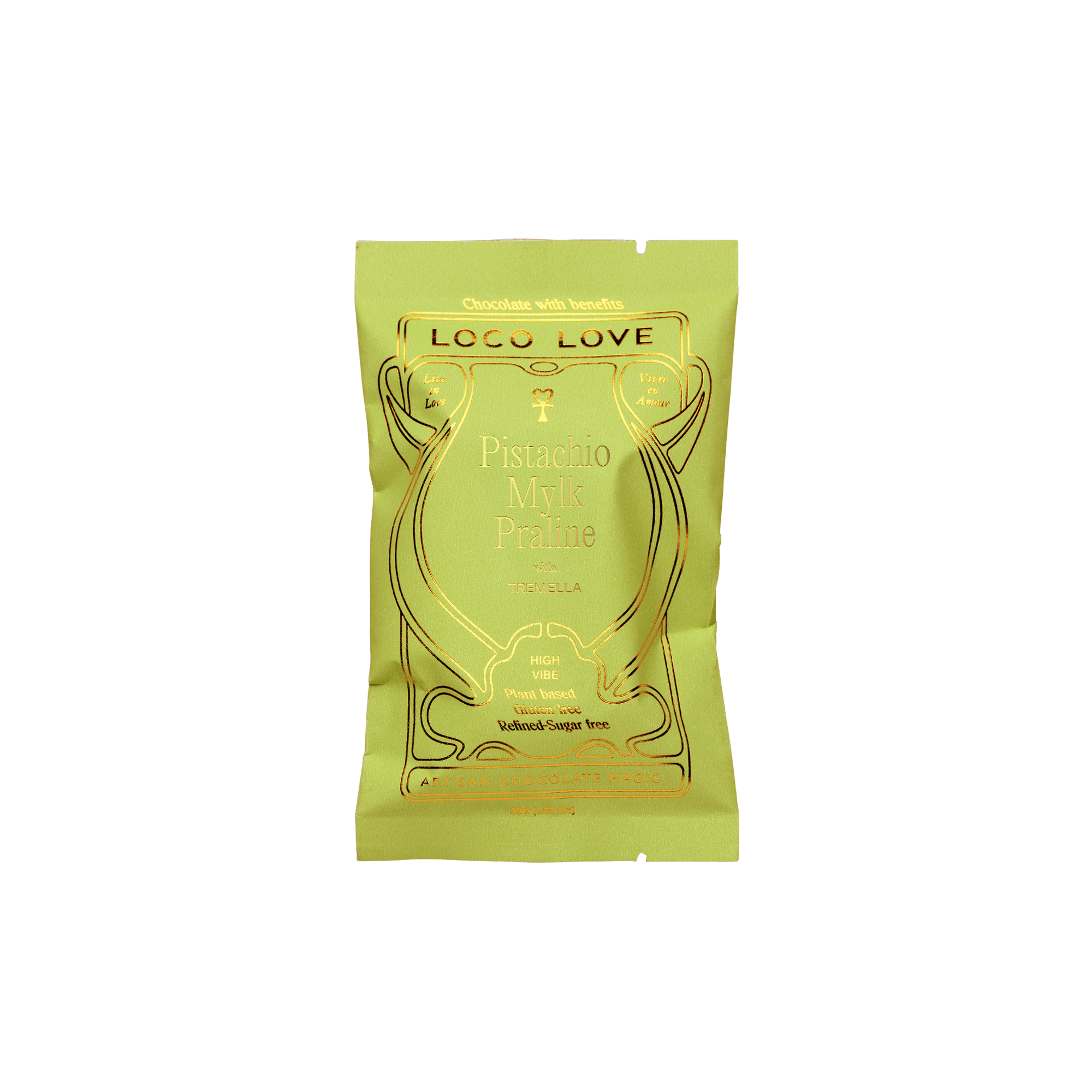 A silky pistachio ganache, dotted with lightly caramelised pistachio pieces. A balance of creamy and crunchy. Sweetened with mineral-rich natural sweeteners and enrobed in our signature mylk chocolate, spiked with beauty mushroom tremella.