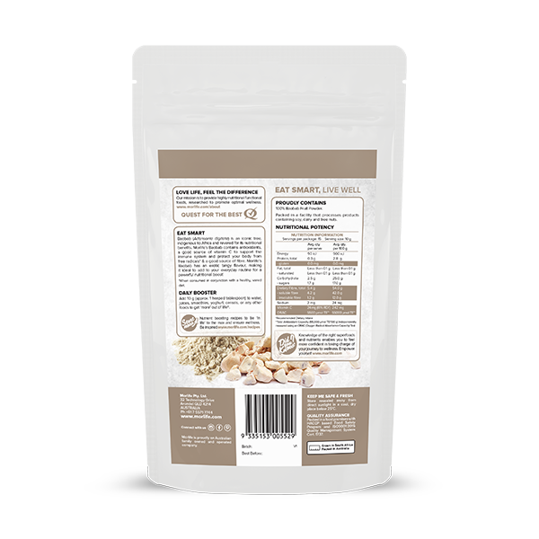 Baobab (Adansonia digitata) is an iconic tree, indigenous to Africa and revered for its nutritional benefits. Morlife’s Baobab contains antioxidants, a good source of vitamin C to support the immune system and protect your body from free radicals* & a good source of fibre. Morlife’s Baobab has an exotic tangy flavour, making it ideal to add to your everyday routine for a powerful nutritional boost!