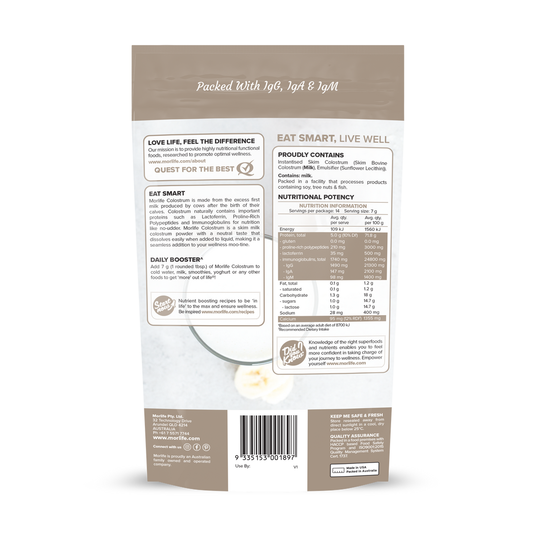 Instantised Skim Colostrum Powder [Skim Colostrum Bovine Milk, MCT Oil, Emulsifier (Sunflower Lecithin)].