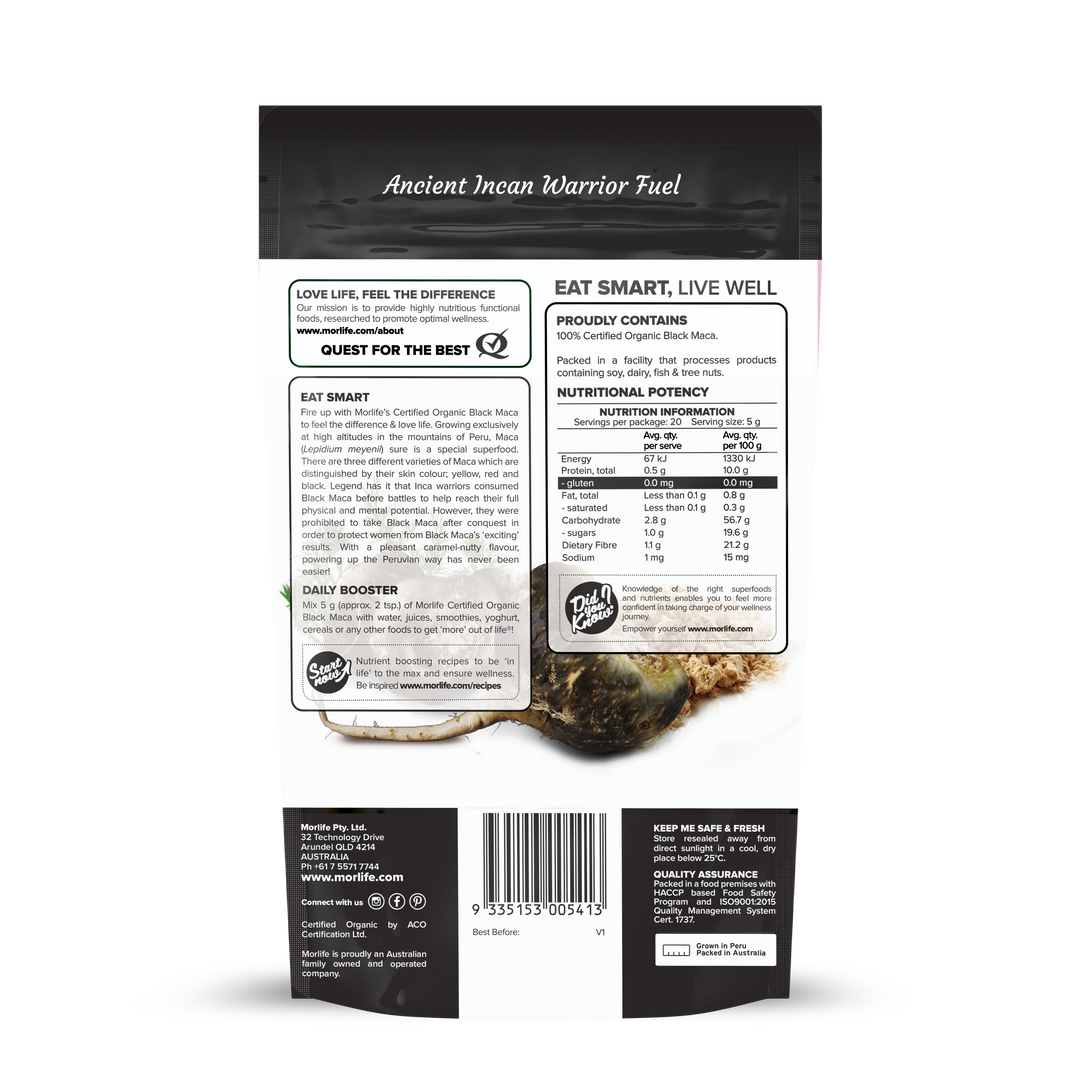 Fire up with Morlife’s Certified Organic Black Maca to feel the difference & love life. Growing exclusively at high altitudes in the mountains of Peru, Maca (Lepidium meyenii) sure is a special superfood. There are three different varieties of Maca which are distinguished by their tuber’s skin colour; yellow, red and black. Legend has it that Inca warriors consumed Black Maca before battles to help reach their full physical and mental potential. However, they were prohibited to take Black Maca after conquest in order to protect women from Black Maca’s ‘exciting’ effects. The ‘magical powers’ of Morlife’s Black Maca uplift the mind, body & soul. With a pleasant caramel-nutty flavour, adding nutrition to your life has never been easier!
