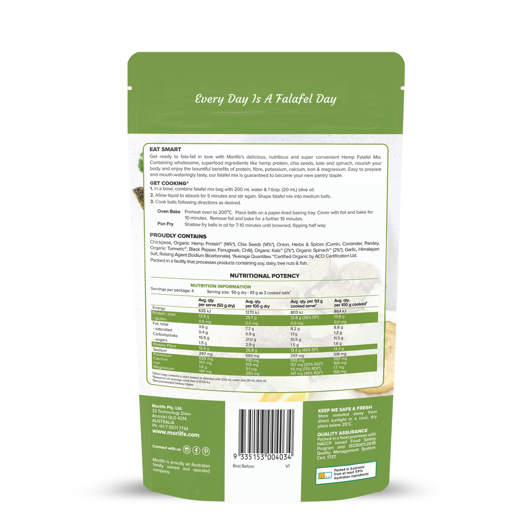 Get ready to fala-fall in love with Morlife’s delicious, nutritious and super convenient Hemp Falafel Mix. Containing wholesome, superfood ingredients like hemp protein, chia seeds, kale and spinach, nourish your body and enjoy the bountiful benefits of protein, fibre, potassium, calcium, iron & magnesium. Easy to prepare and mouth-wateringly tasty, our falafel mix is guaranteed to become your new pantry staple.