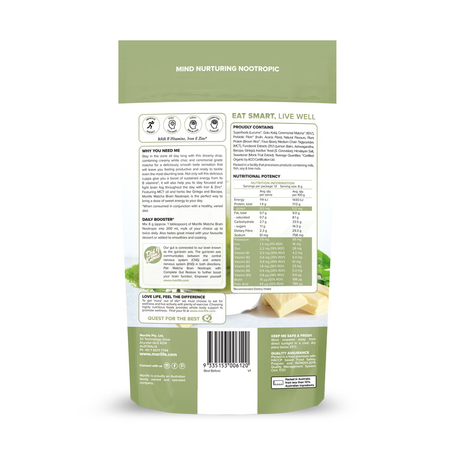 Superfoods (Lucuma~, Gotu Kola), Ceremonial Matcha~ (15%*), Prebiotic Fibre~ (Inulin, Acacia Fibre), Natural Flavours, Plant Protein (Brown Rice~, Fava Bean), Medium Chain Triglycerides (MCT), Functional Extracts (3%*) (Lemon Balm, Ashwagandha, Bacopa, Ginkgo), Inactive Yeast (S. cerevisiae), Himalayan Salt, Sweetener (Monk Fruit Extract). *Average Quantities ~Certified Organic by ACO Certification Ltd.