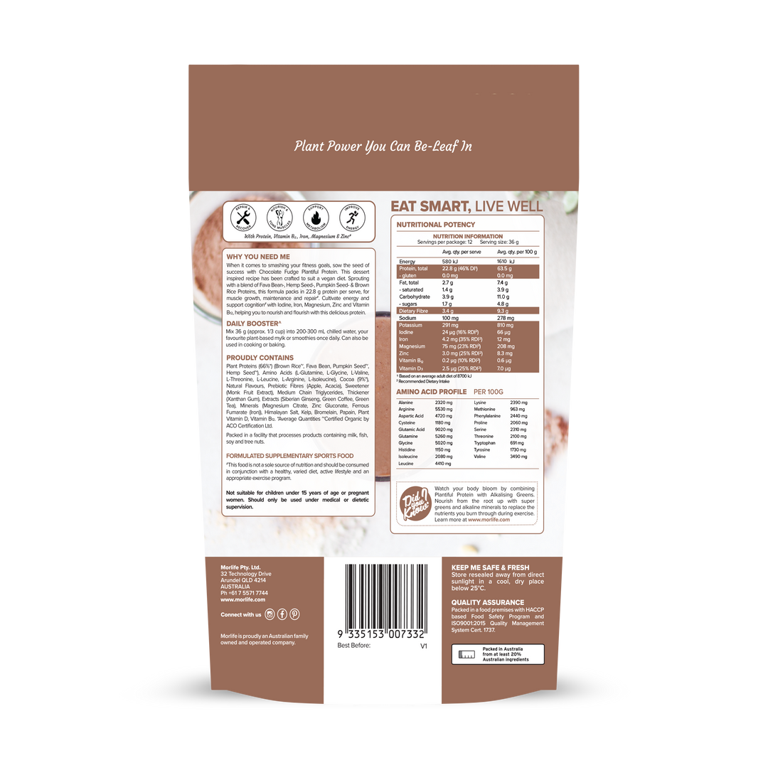 Complete Plant-Based Protein! New Size, Same Great Quality, Even Better Price! When it comes to smashing your fitness goals, sow the seed of success with Chocolate Fudge Plantiful Protein. This dessert inspired recipe has been crafted to suit a vegan diet. Sprouting with a blend of Fava Bean, Hemp Seed, Pumpkin Seed & Brown Rice Proteins, this formula packs in 22.8 g protein per serve, for muscle growth, maintenance and repair#. Cultivate energy and support cognition# with Iodine, Iron, Magnesium, Zinc and Vitamin B12, helping you to nourish and flourish with this delicious protein.