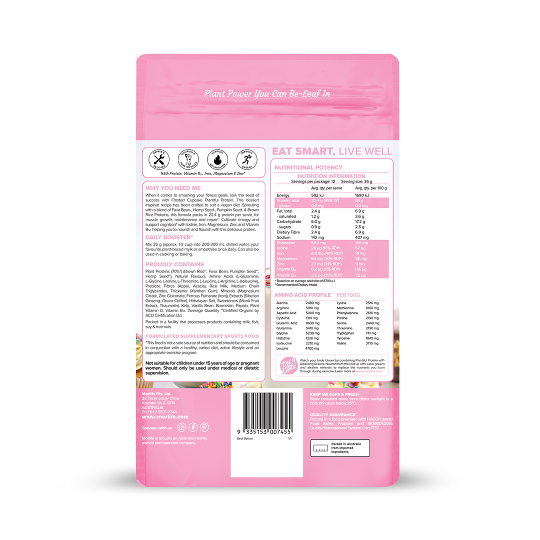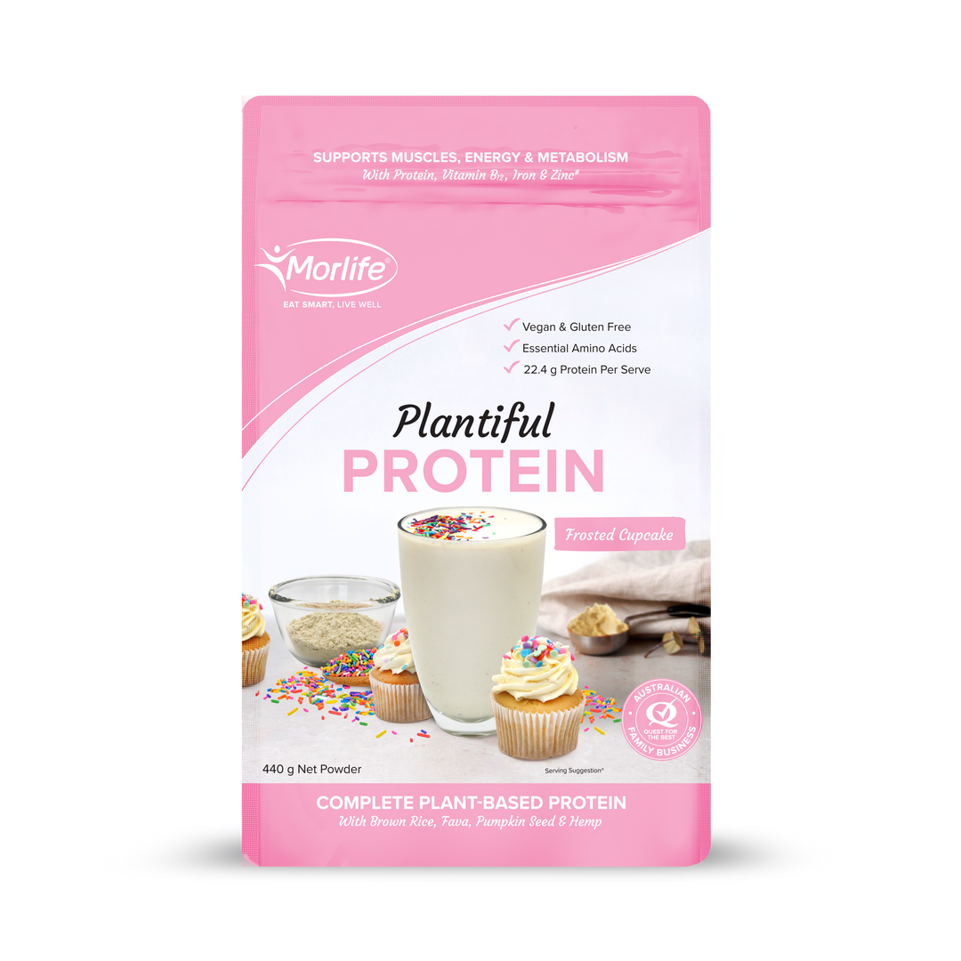 Support recovery, energy, and focus all in one. More than just a plant-based protein, Frosted Cupcake Plantiful Protein delivers 22.4 g of complete protein plus essential nutrients like Iron, Magnesium, Zinc and B12 to help you repair muscles, boost metabolism and stay sharp. Perfect for vegans, fitness lovers and anyone wanting to feel fuller for longer. It is the ultimate blend to help you feel the difference and thrive