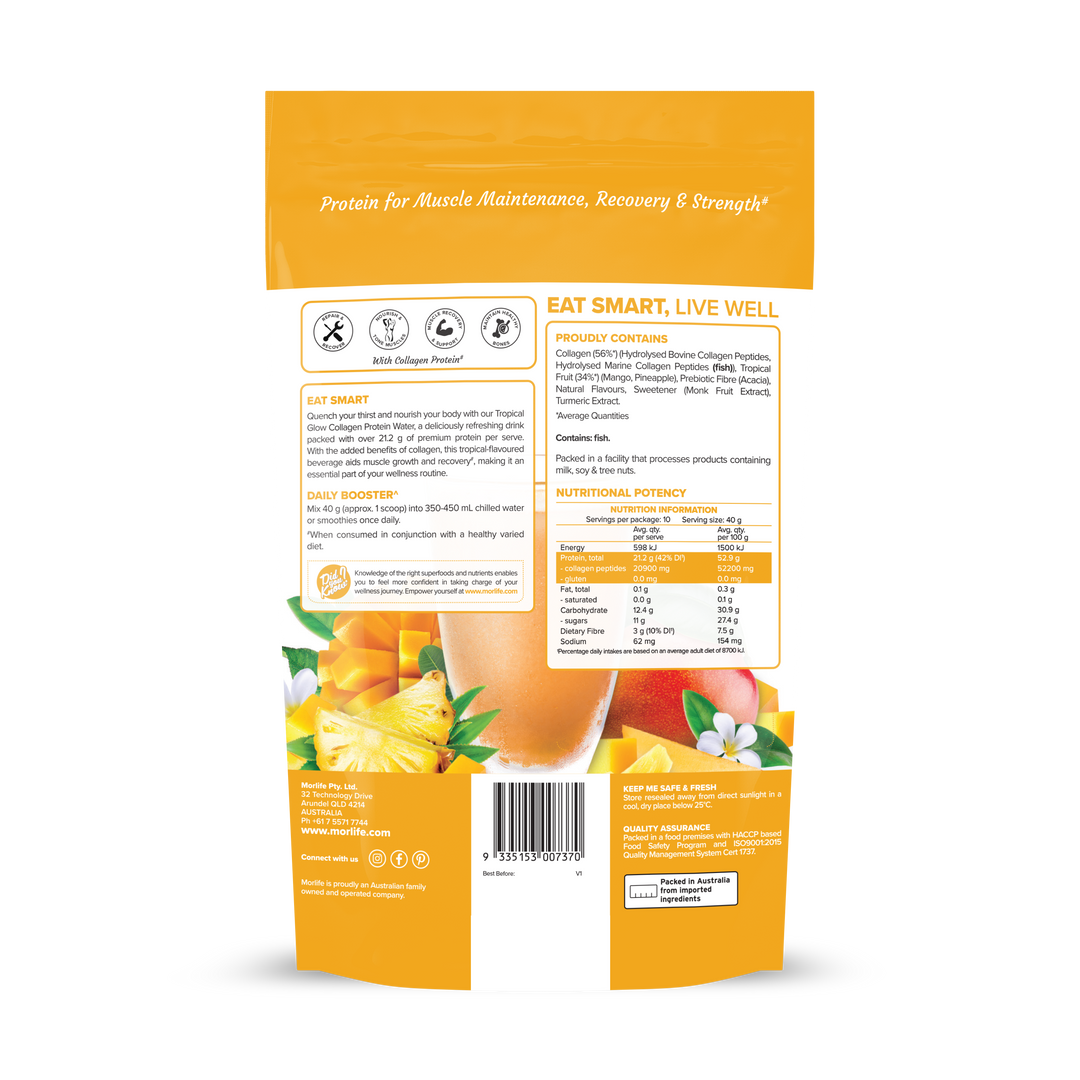 Collagen (56%*) (Hydrolysed Bovine Collagen Peptides, Hydrolysed Marine Collagen Peptides (fish)), Tropical Fruit (34%*) (Mango, Pineapple), Prebiotic Fibre (Acacia), Natural Flavours, Sweetener (Monk Fruit Extract), Turmeric Extract. *Average Quantities