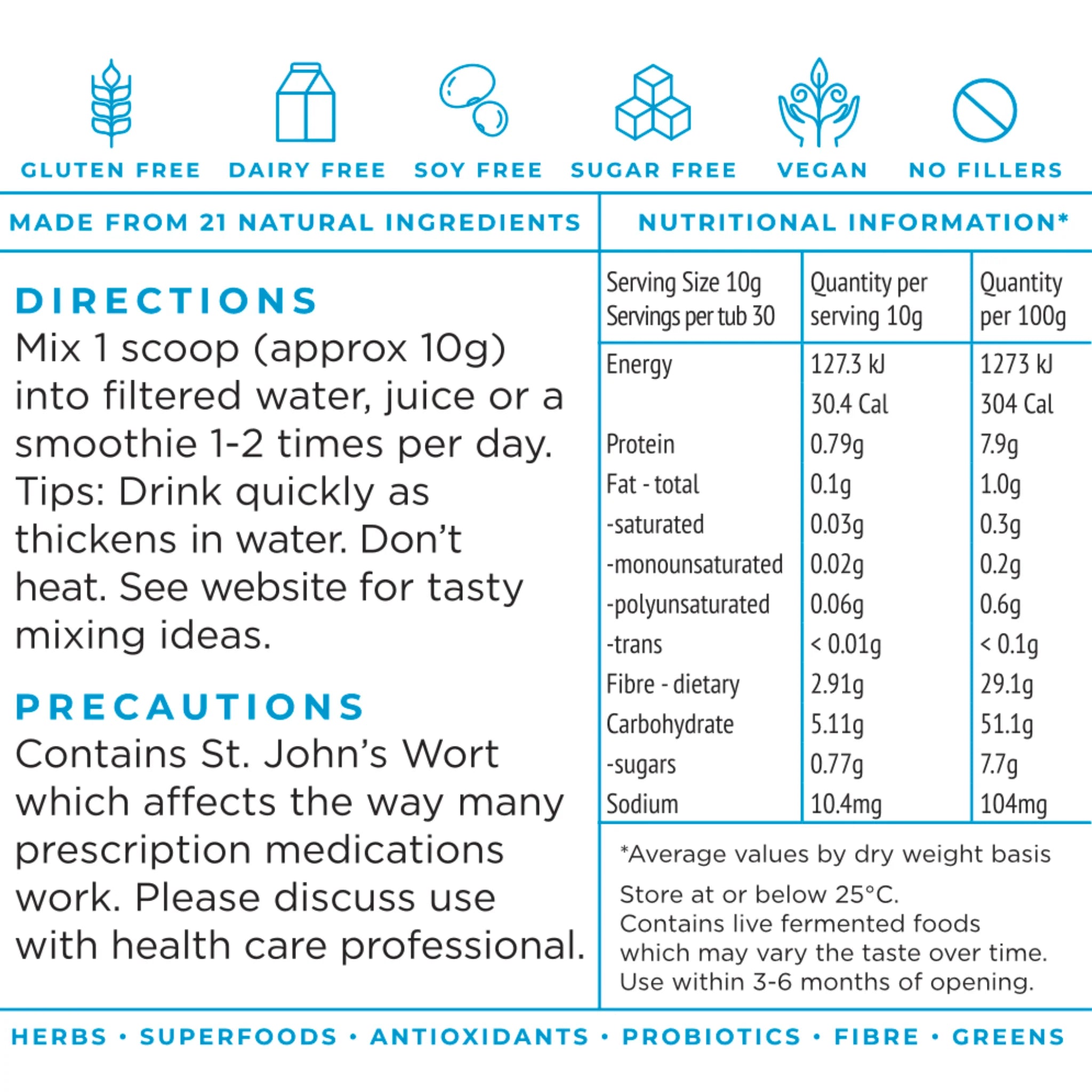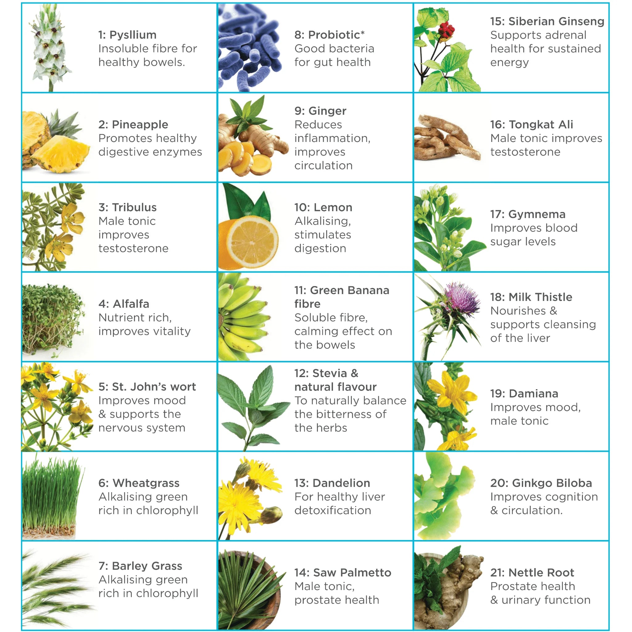 psyllium, pineapple, tribulus, alfalfa, St. John's wort, wheatgrass, barley grass, multi strain probiotic*, ginger, lemon, green banana fibre, stevia & natural flavour, dandelion, saw palmetto, siberian ginseng, tongkat ali, gymnema, milk thistle, damiana, ginkgo biloba, nettle root.