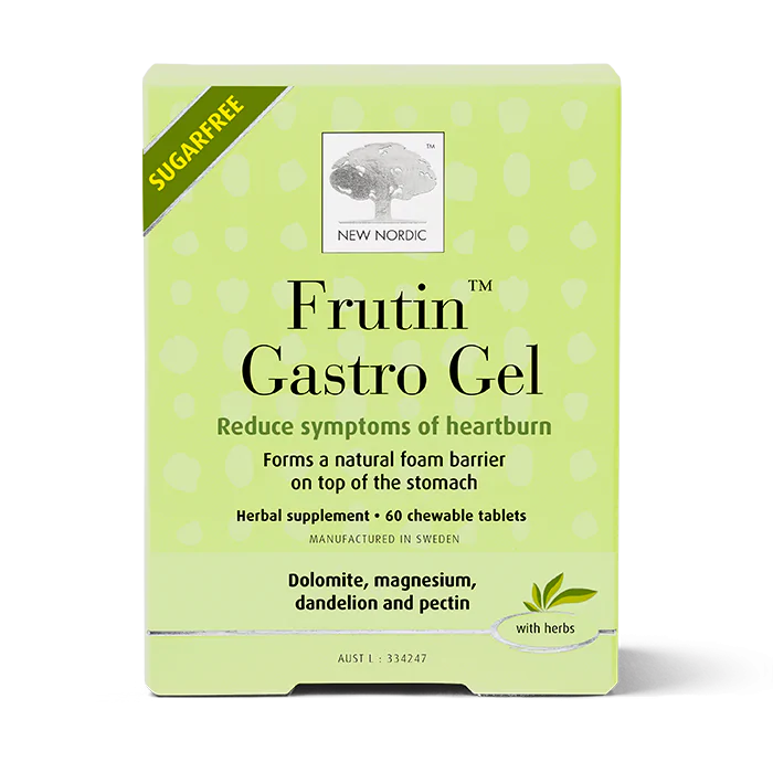 Frutin™ Gastrol Gel is a sugar-free, chewable formula that aims to reduce symptoms of heartburn. The pectin fruit fibre forms a natural foam barrier on top of the stomach, limiting the contact between the acid content of the stomach and the sensitive walls of the oesophagus. Dandelion root aids digestion and calcium is also linked to improved muscle function, reducing heartburn symptoms.