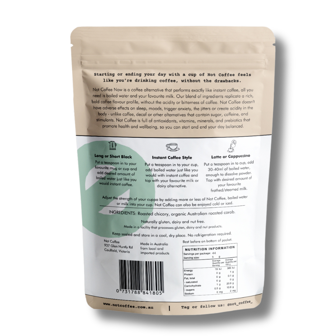 Not Coffee Now is an INSTANT caffeine and stimulant-free coffee alternative designed specifically for coffee lovers who need or want to eliminate caffeine due to health reasons or lifestyle choices. Expertly crafted to replicate your coffee ritual, it looks, brews, and tastes as close to real coffee as possible - minus the acidity and unwanted side effects.