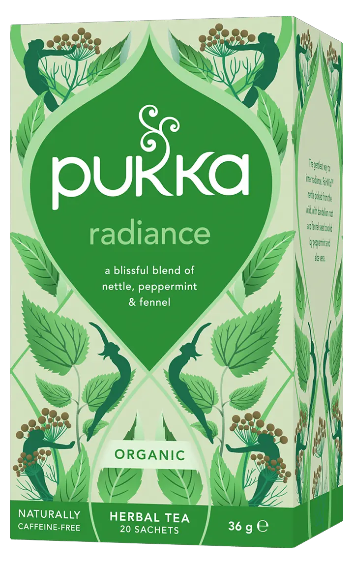 Blended by our in-house herbal experts and nutritionists, our Radiance tea combines the latest scientific research with traditional herbal wisdom to support your body and skin naturally. Each compostable tea bag is full of essential oils and the highest quality organic herbs, specifically sourced for their nourishing and purifying properties. Nettle's purifying properties work to balance you from the inside out, promoting a bright complexion, whist peppermint leaves and aloe vera work synergistically to cool and soothe the skin. Dandelion is added to support your normal functions, helping the body to maintain its essential nutrients, whilst fennel is brimming with essential oils that support your body’s natural digestive process.