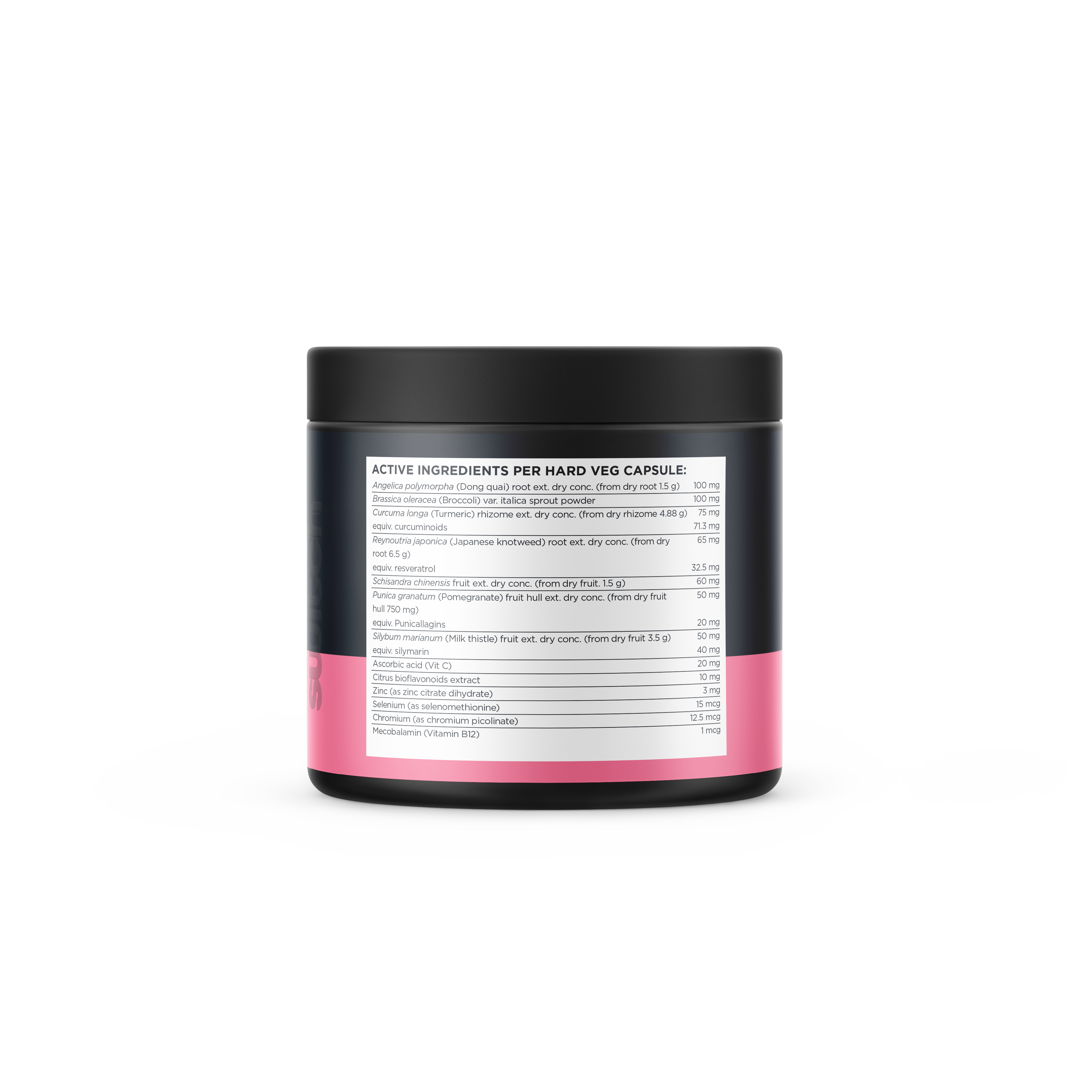 Angelica Polymorpha Root Ext. Dry Conc. From Dry Root, Brassica Oleracea Var. Italica Sprout Powder, Curcuma Longa Rhizome Ext. Dry Conc. From Dry Rhizome Equiv., Curcuminoids, Reynoutria Japonica Root Ext. Dry Conc. From Dry Root Equiv., Resveratrol, Schisandra Chinensis Fruit Ext. Dry Conc. From Dry Fruit, Punica Granatum Fruit Hull Ext. Dry Conc. From Dry Fruit Hull Equiv. Punicallagins, Silybum Marianum Fruit Ext. Dry Conc. From Dry Fruit Equiv. Silymarin, Ascorbic Acid (Vit C), Citrus Bioflavonoids Extract, Zinc (As Zinc Citrate Dihydrate), Selenium (As Selenomethionine), Chromium (As Chromium Picolinate), Mecobalamin (Vitamin B12)